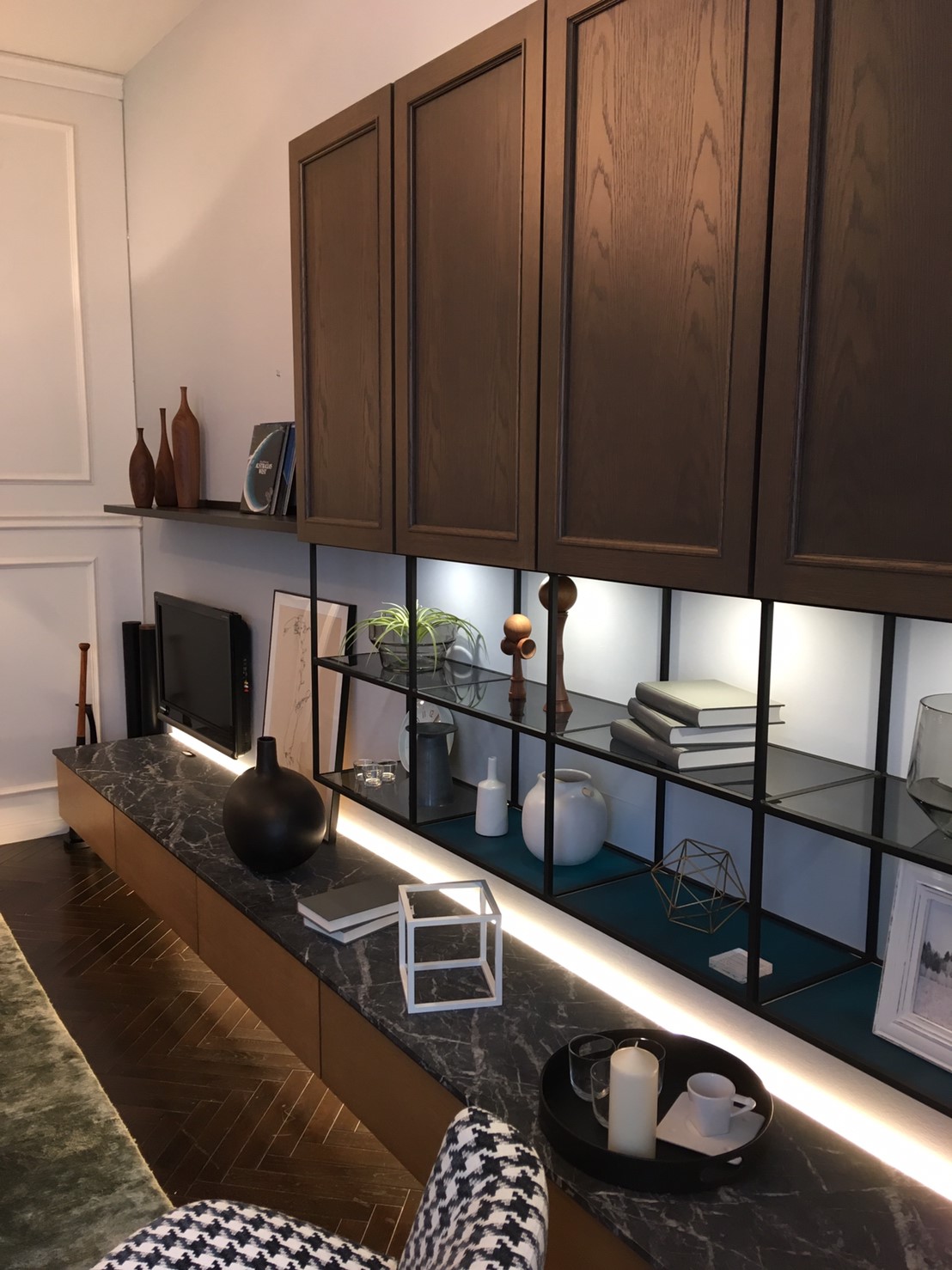 で構成されたキャビネットをジョイントしていく家具製作工法で展開した