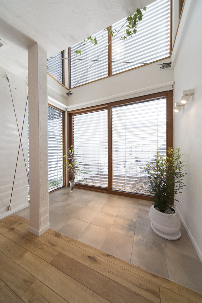 ↓ 内側から見た吹抜けサンルーム 下左写真は外付けブラインドを上げているところ 下右写真はブラインドを下げているところ