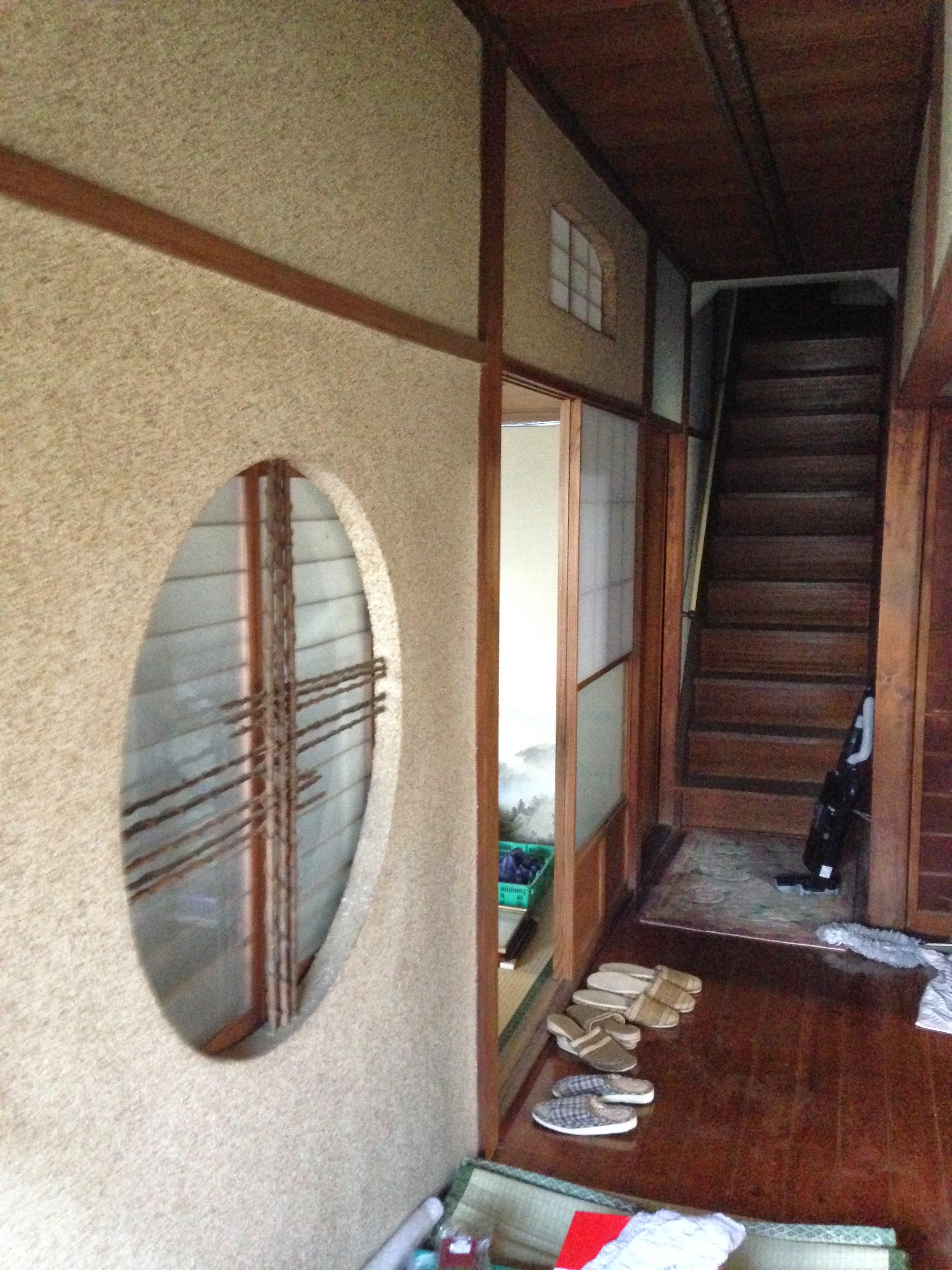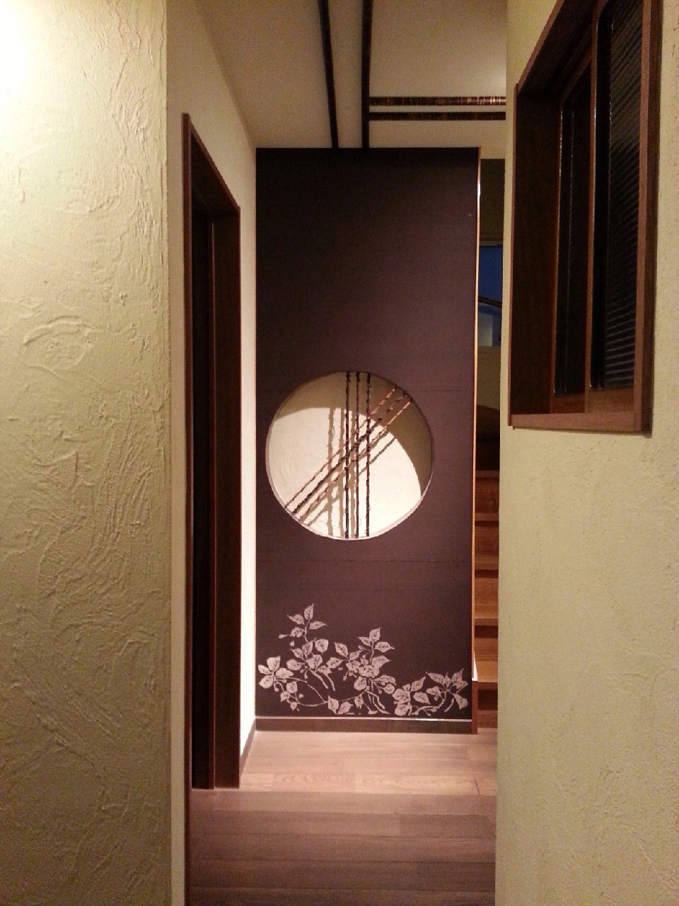 和の風情ある丸型にくり抜いた造形壁   こちらはもとの廊下に明りとりとして存在していました。