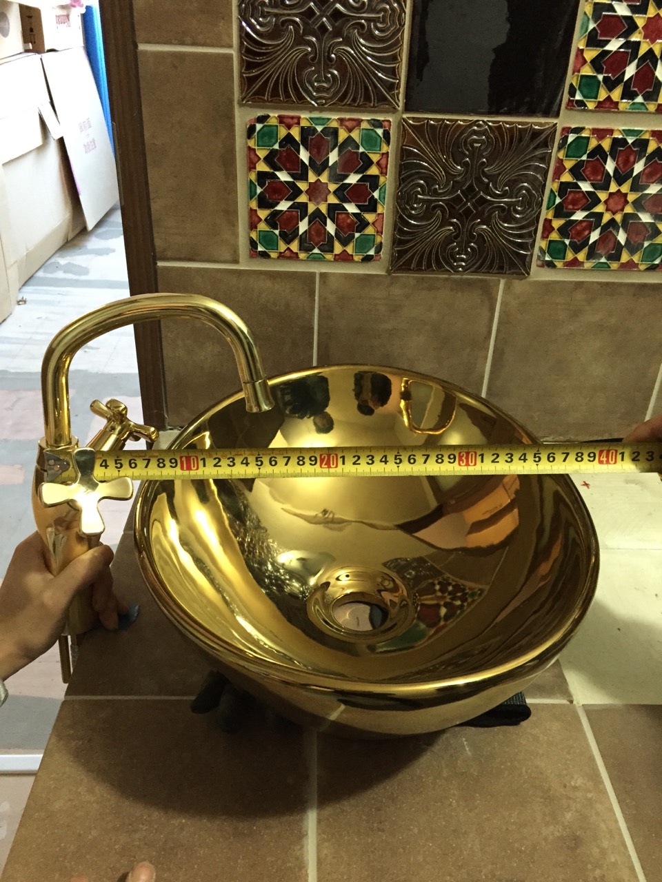 ブラウン系のアンティークタイルをベースとして、ゴールドの手洗ボウルや水栓をチョイスしています。