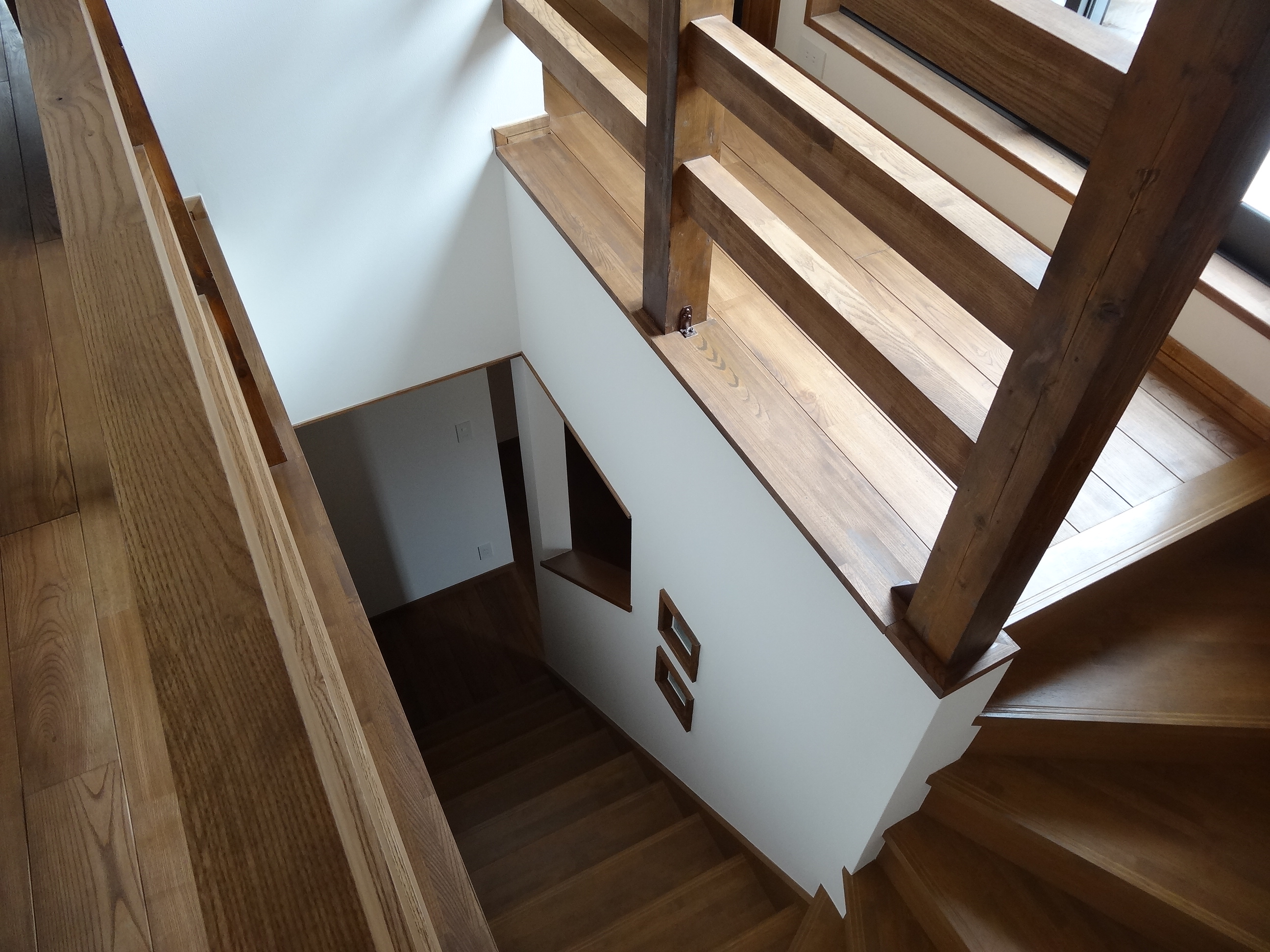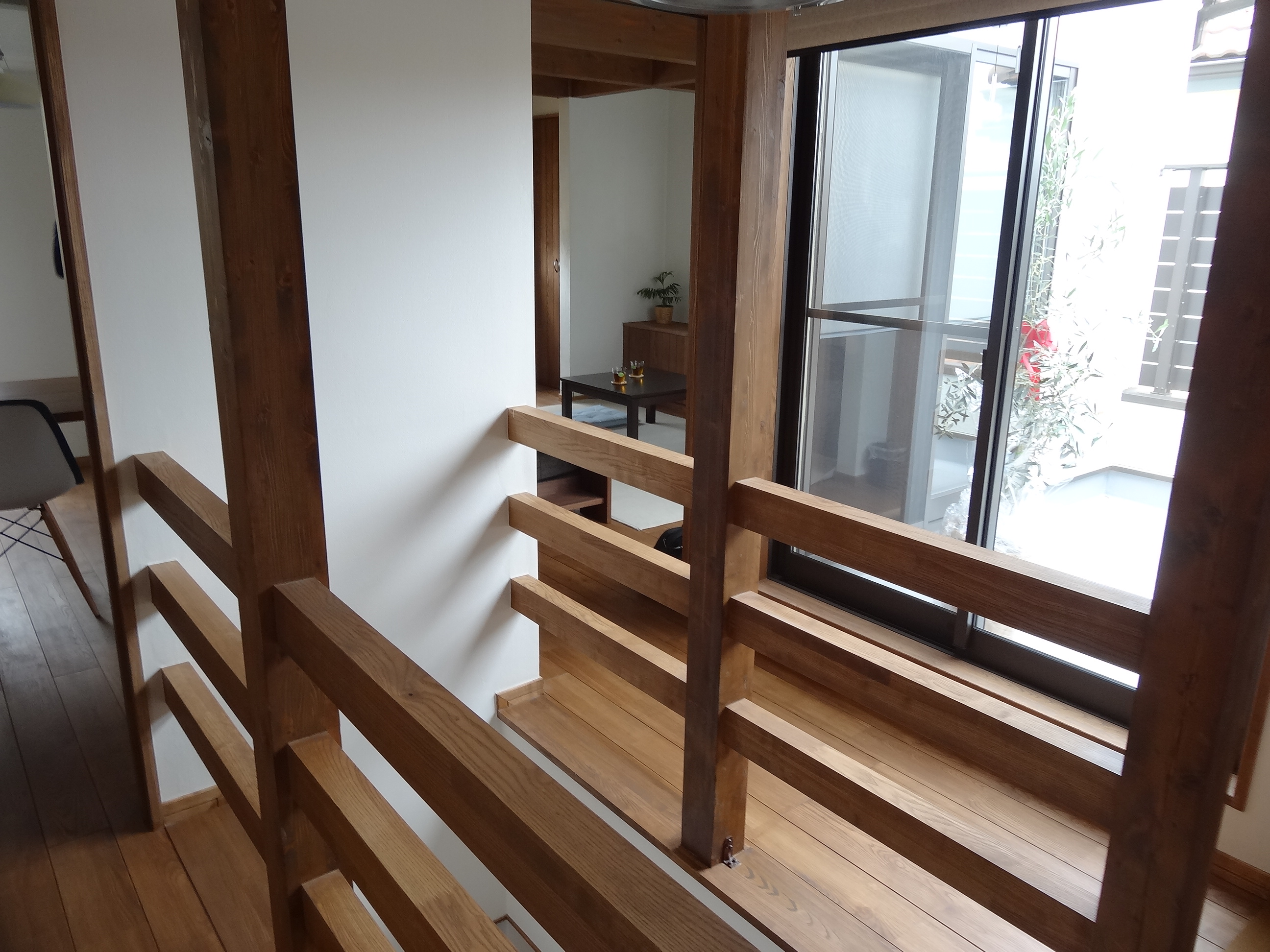 階段廻りの既存柱も抜かず、磨いて塗装し手摺などを取付。アクセントに。
