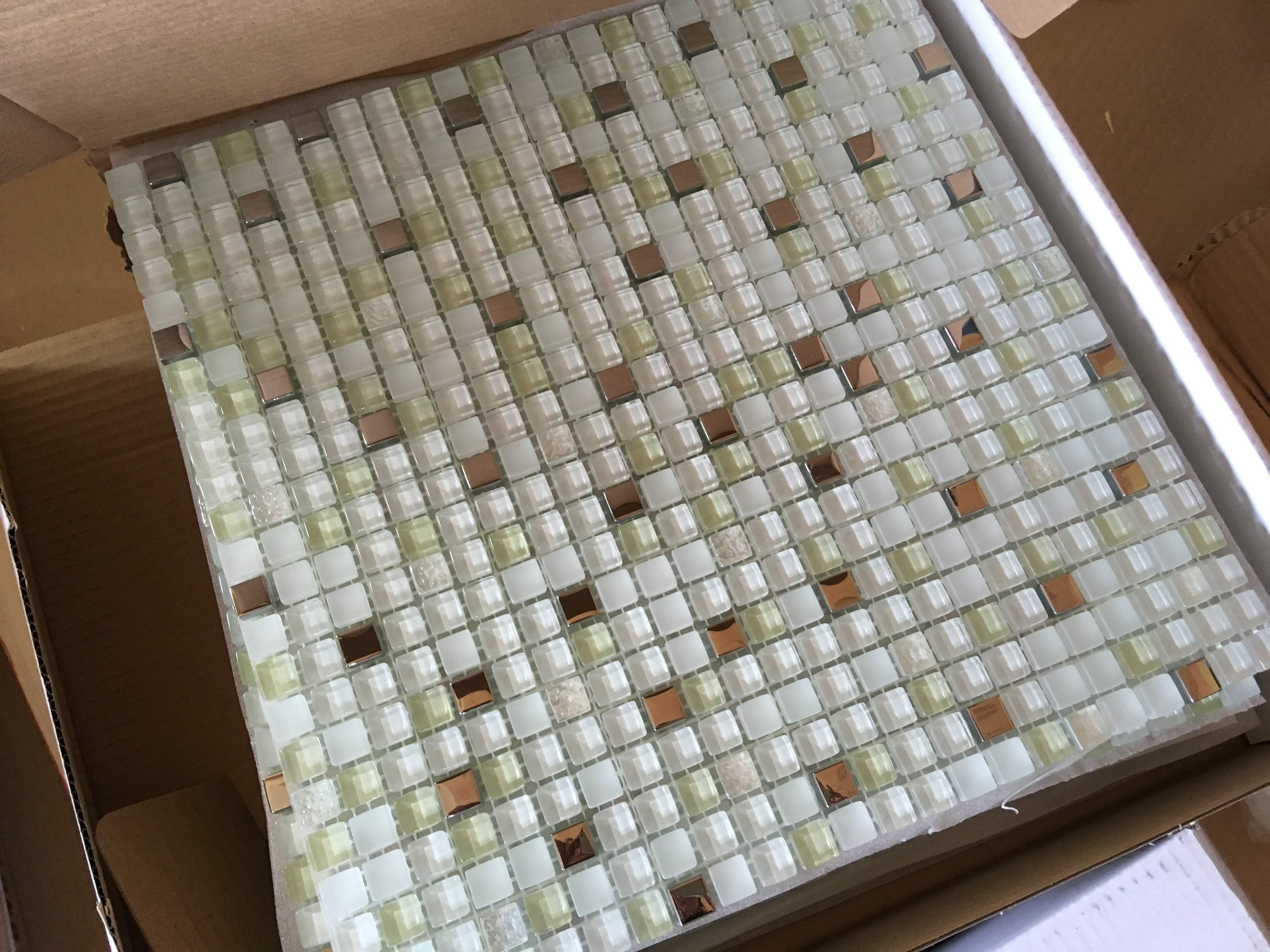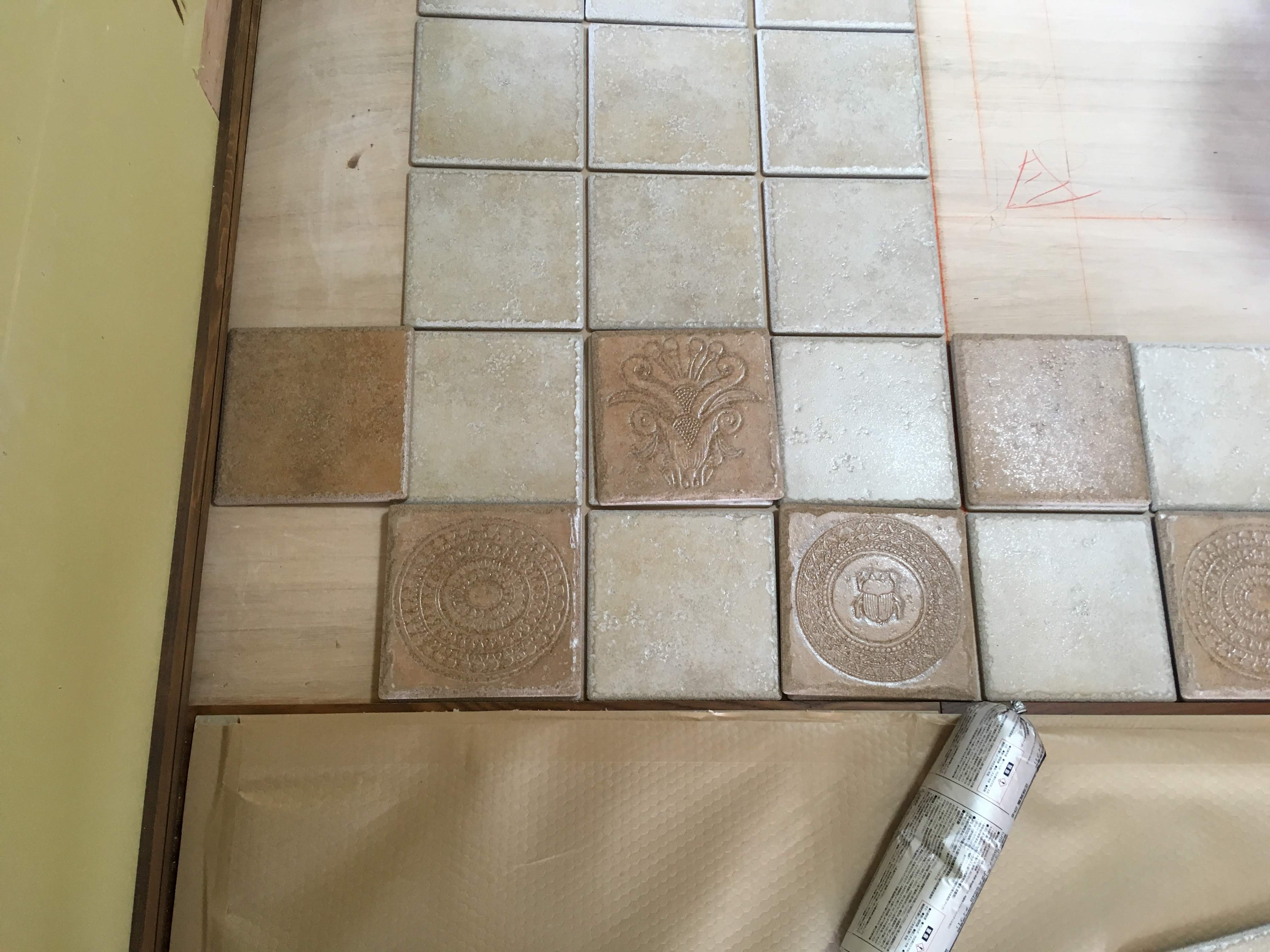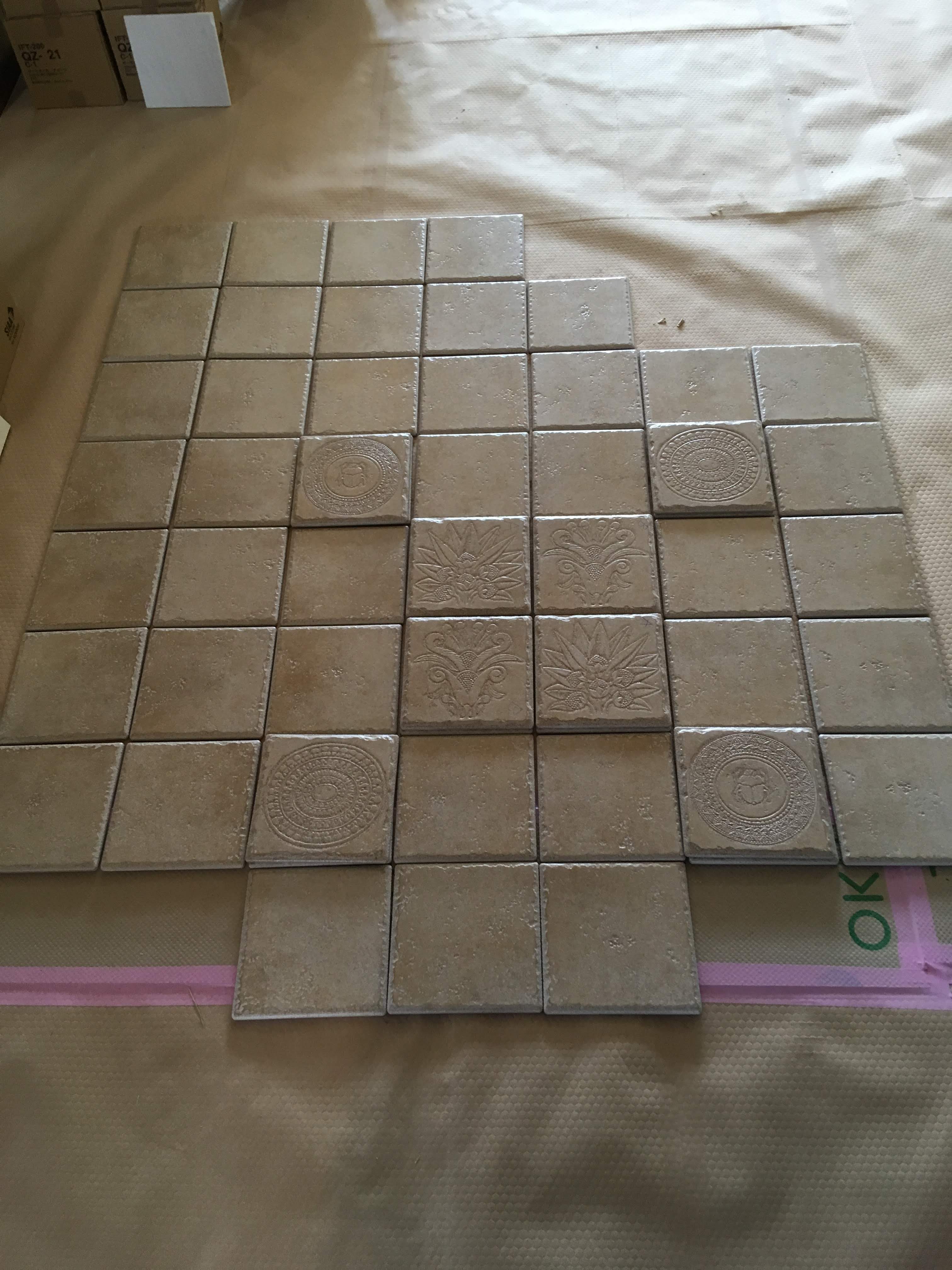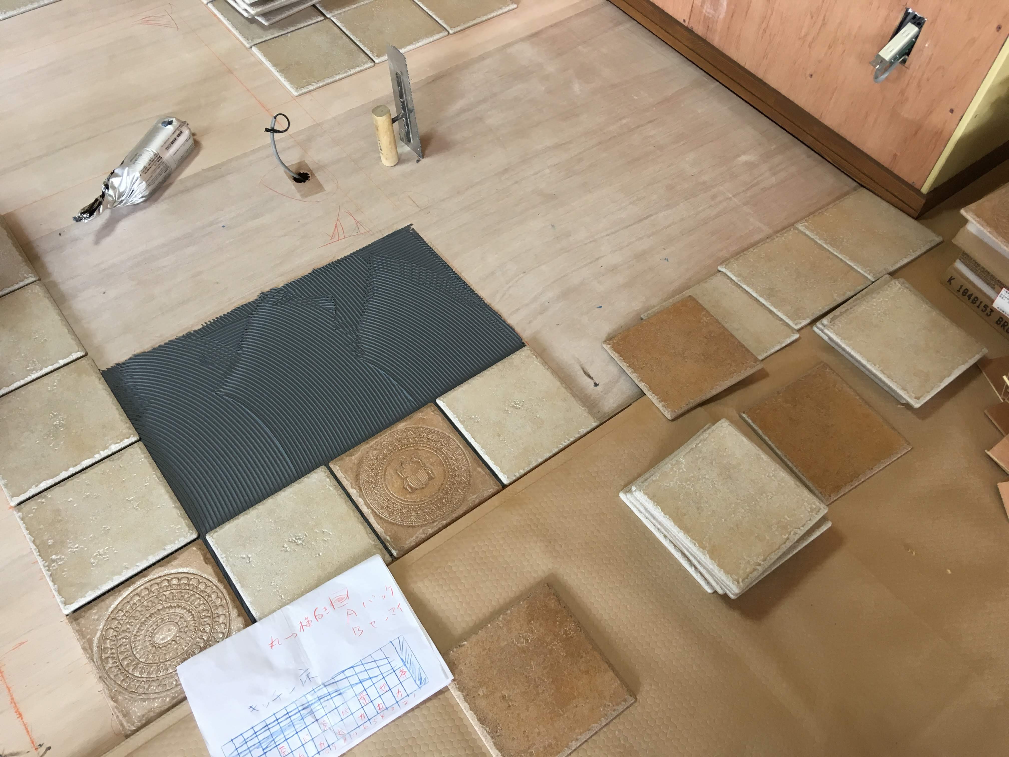 キッチン・玄関・洗面所・トイレと床や壁にタイルを施工します。 今日は、お施主様とタイルを置いて柄位置など確認中。 仕上がりを考えると、とても楽しい時間でした。