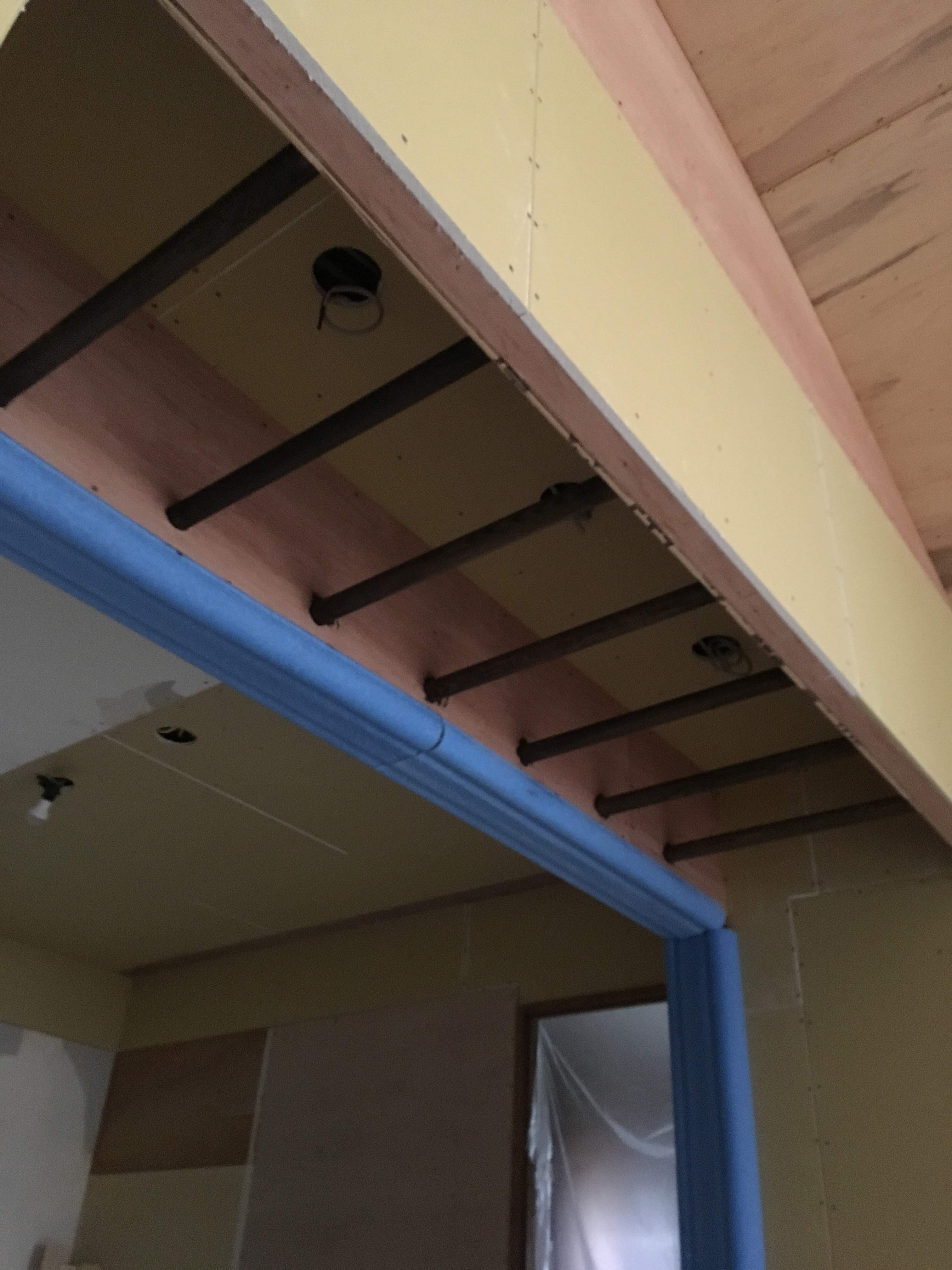 隠し照明を入れた部分に、木製のバーを組み込みました。