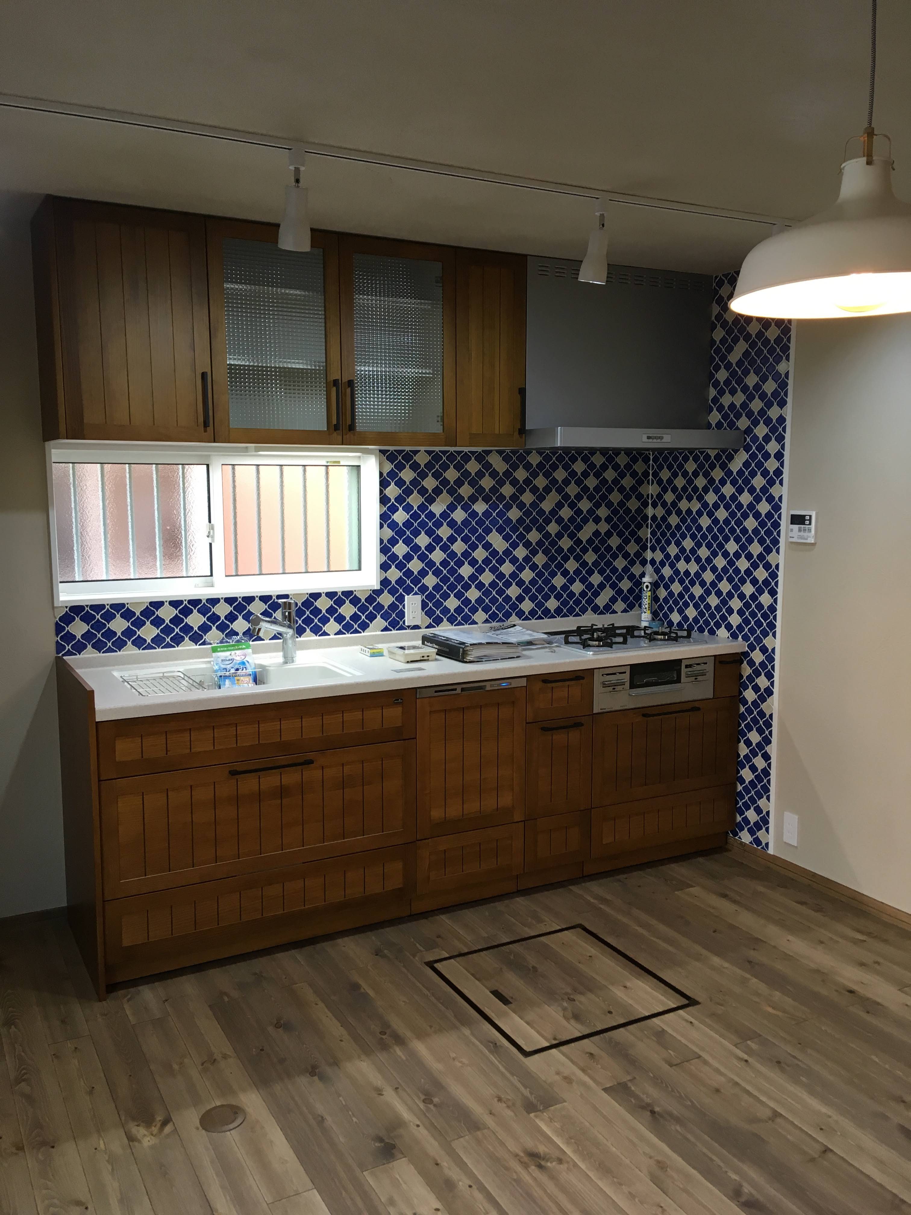ブラウンの木製キッチンに、青と白のタイルがとても素敵に仕上がりました。