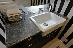化粧台は、木製のブラック扉に人工大理石の天板。