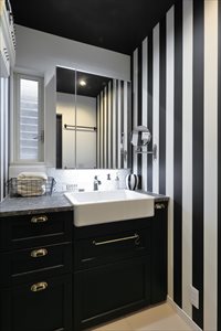 黒・白のモノトーンカラーで仕上げた化粧室。