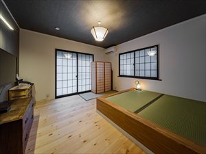窓には、障子タイプの内窓を設置し断熱を高めています。床の無垢材と壁の珪藻土(グレー)が落ちつく和モダン空間のアクセントに。