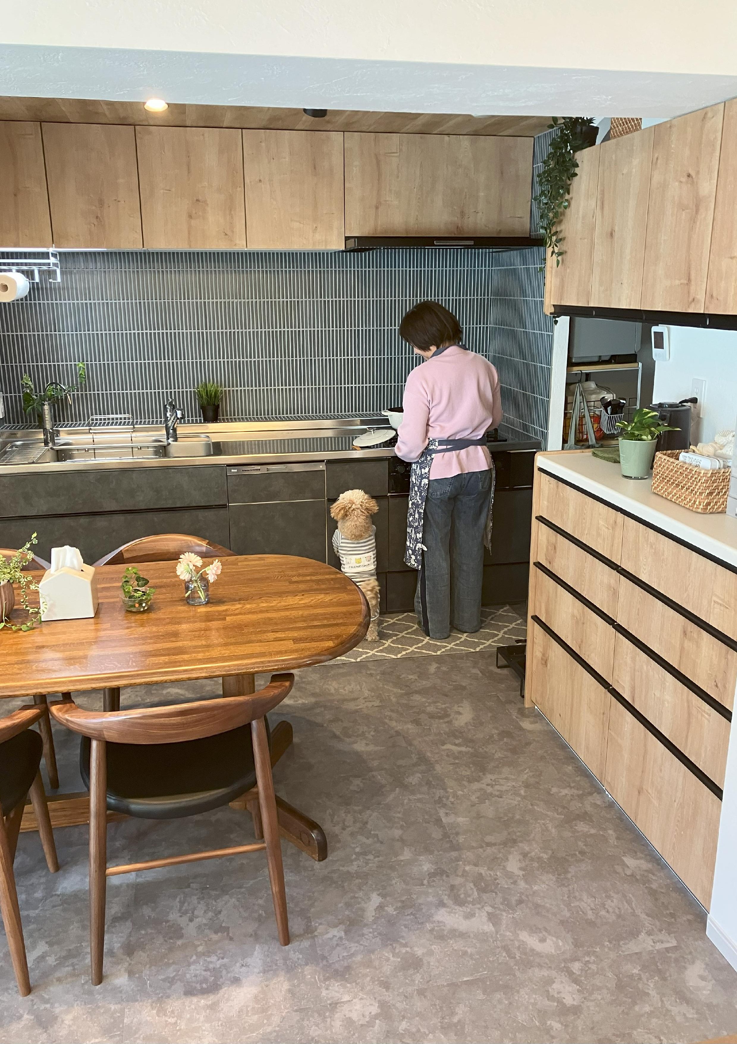 リノベーションテーマには、コロちゃんも快適に過ごせるようにとご要望もあり、滑らない対策の床材・コロちゃん用品の収納やトイレ+ケージ場所も考え、またトリミング台も洗面所に設置しました。
