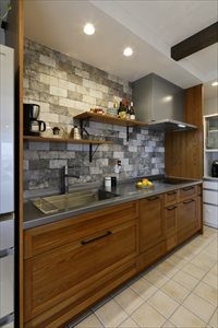 天然木のキッチンにグレー調のストーンタイル。 天井には、ご主人様からご希望の梁を取付け。 イギリスの田舎のような落ち着いたキッチンで、奥様と会話をしながら朝食などを食べたいというご要望。 また、...