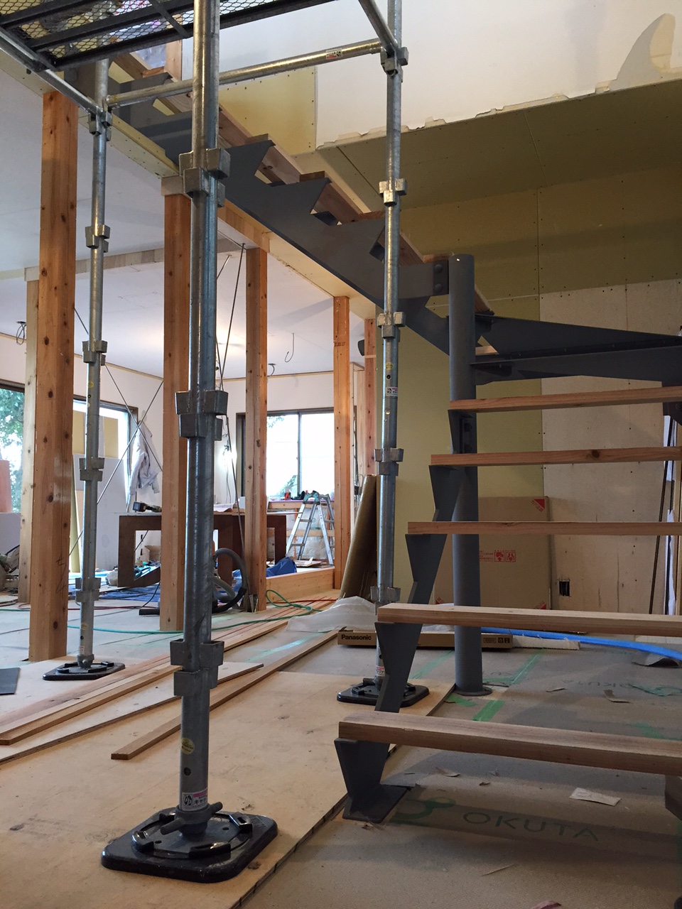 工事進行中のY様邸の1階LDKの吹き抜け部分に鉄骨階段が