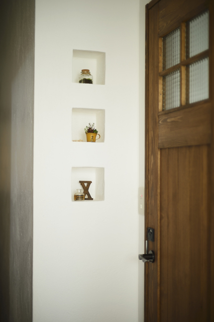 玄関ドアをあけた正面には、小ぶりなニッチを3つ並べてみました。