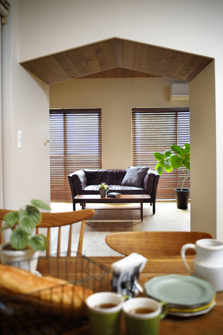 ダイニング側から、ちいさなお家越しに見る素敵なソファーは、