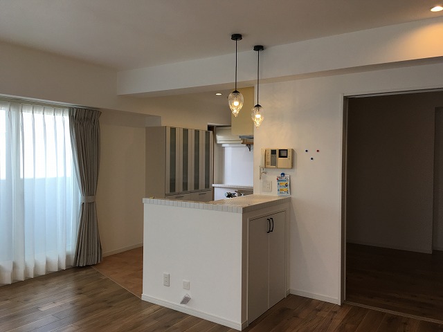 壁に囲われていて暗い印象だったキッチンが一気に晴れやかな空間に。