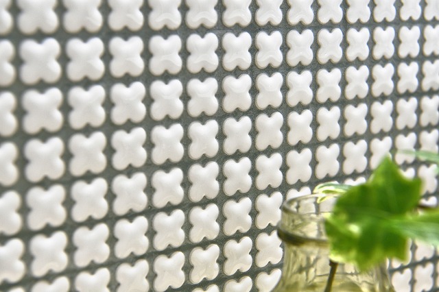四つ葉のクローバー型のタイルの目地も「ブルーグレー」にしたので、