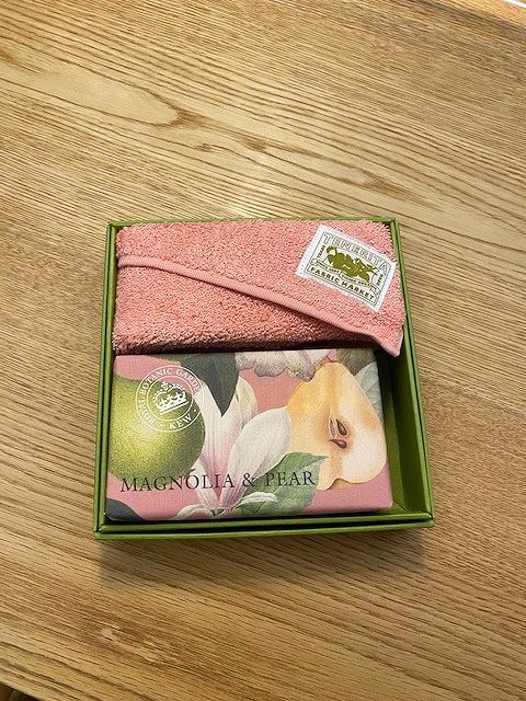 あま~い香りの石鹸とピンクのハンドタオル、