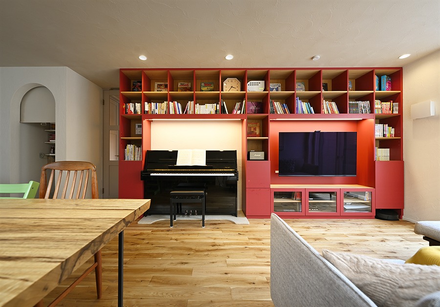 ビビットな赤のカラーとオークの組み合わせが目を引く、