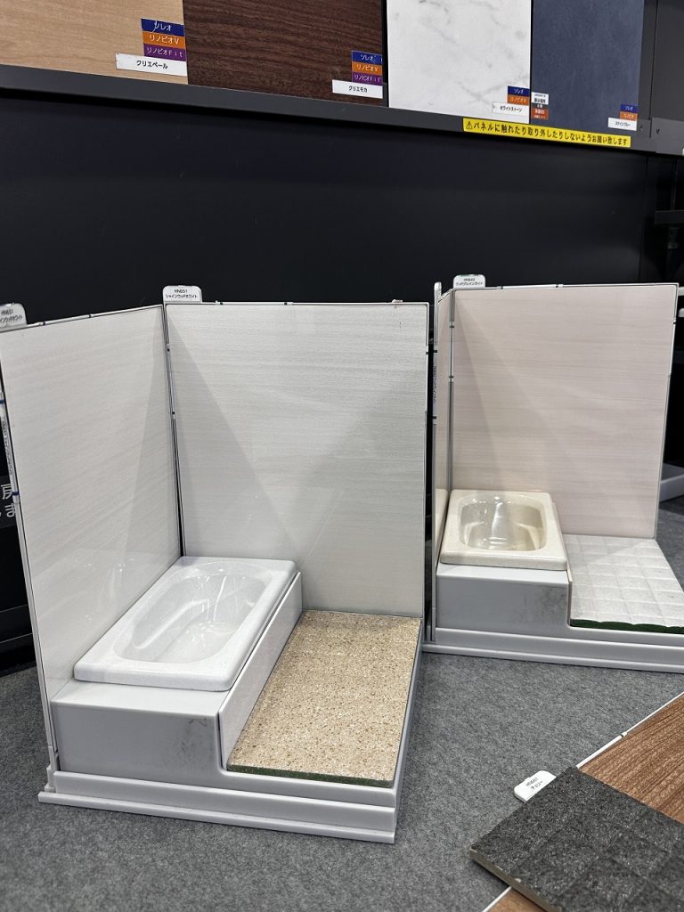 ショールームに全部の壁デザインや床デザインの実物大を置くことができないので、 ユニットバスは小さな模型でお打合せをします。 ご自分で壁の色を変えたり、 床や浴槽の色を変えたり、 お好きにアレンジできるのでイメ...