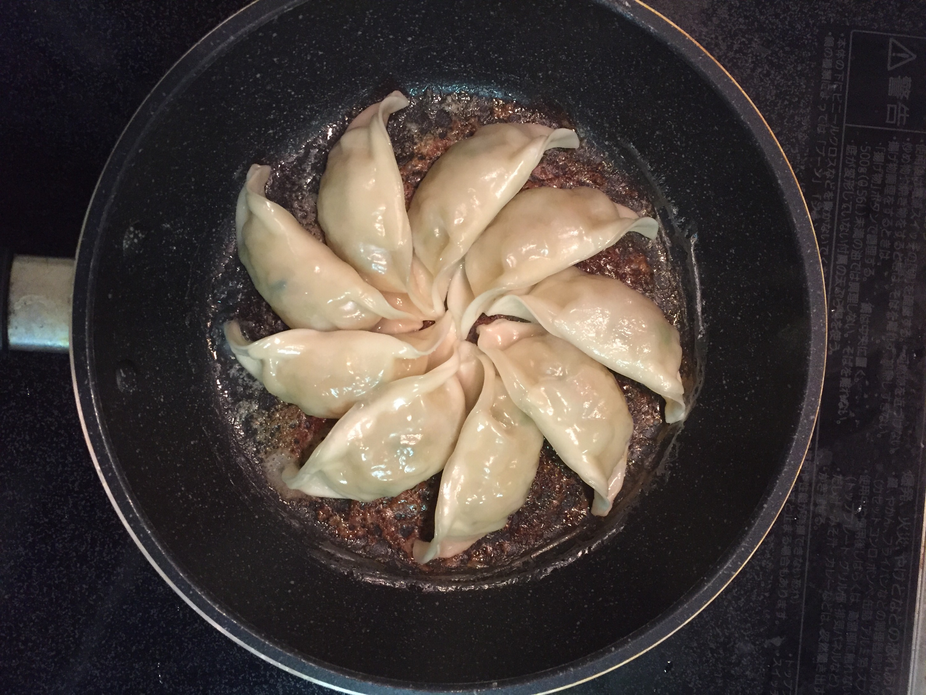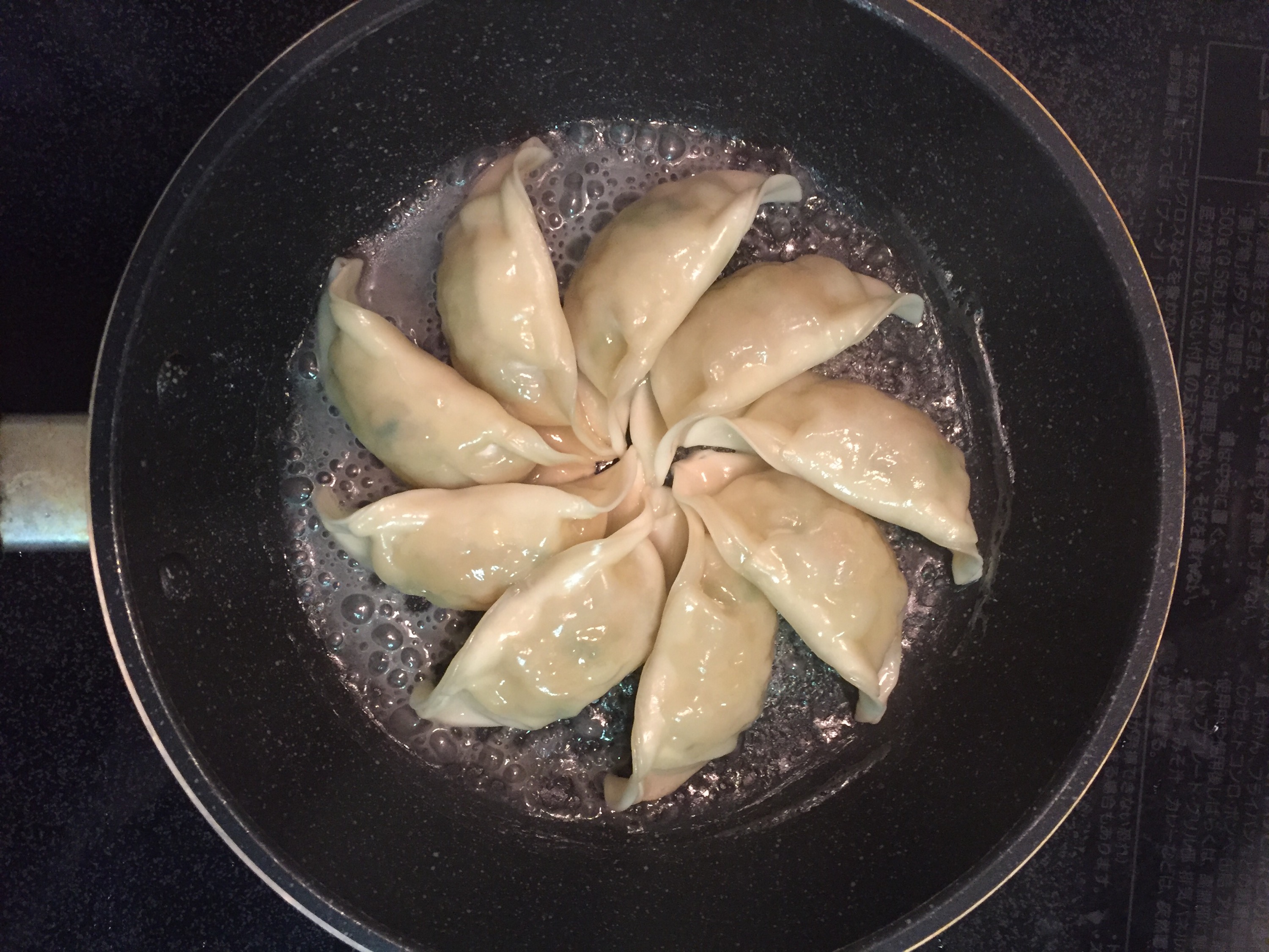 餃子の皮に艶が出たら、蓋を外し水分を蒸発…