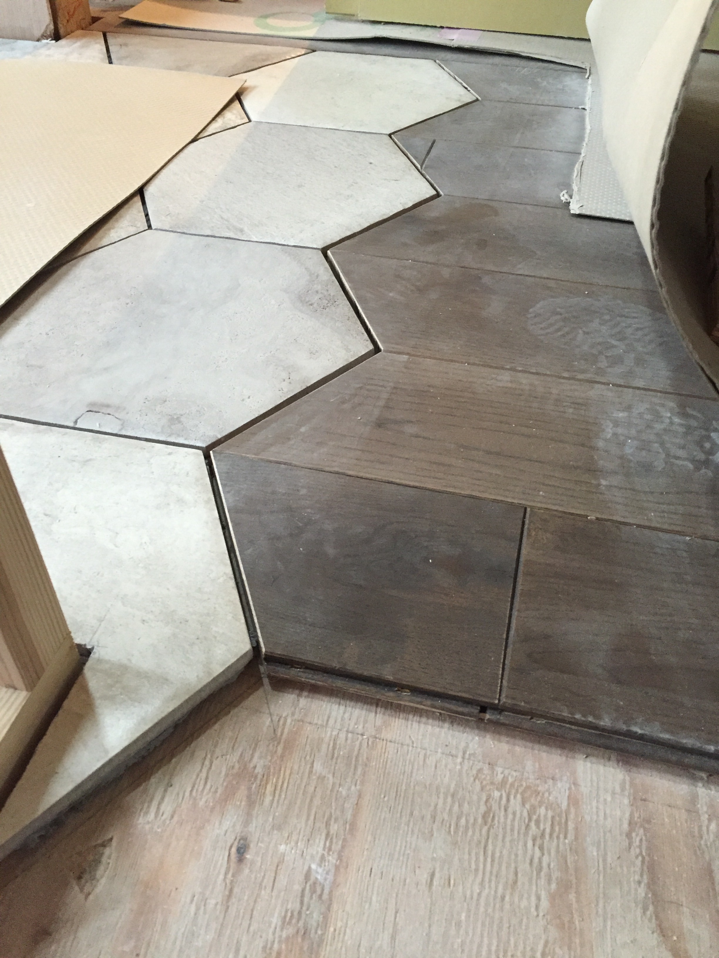 2階インナーガーデンの床には6角形のタイルを貼ります。