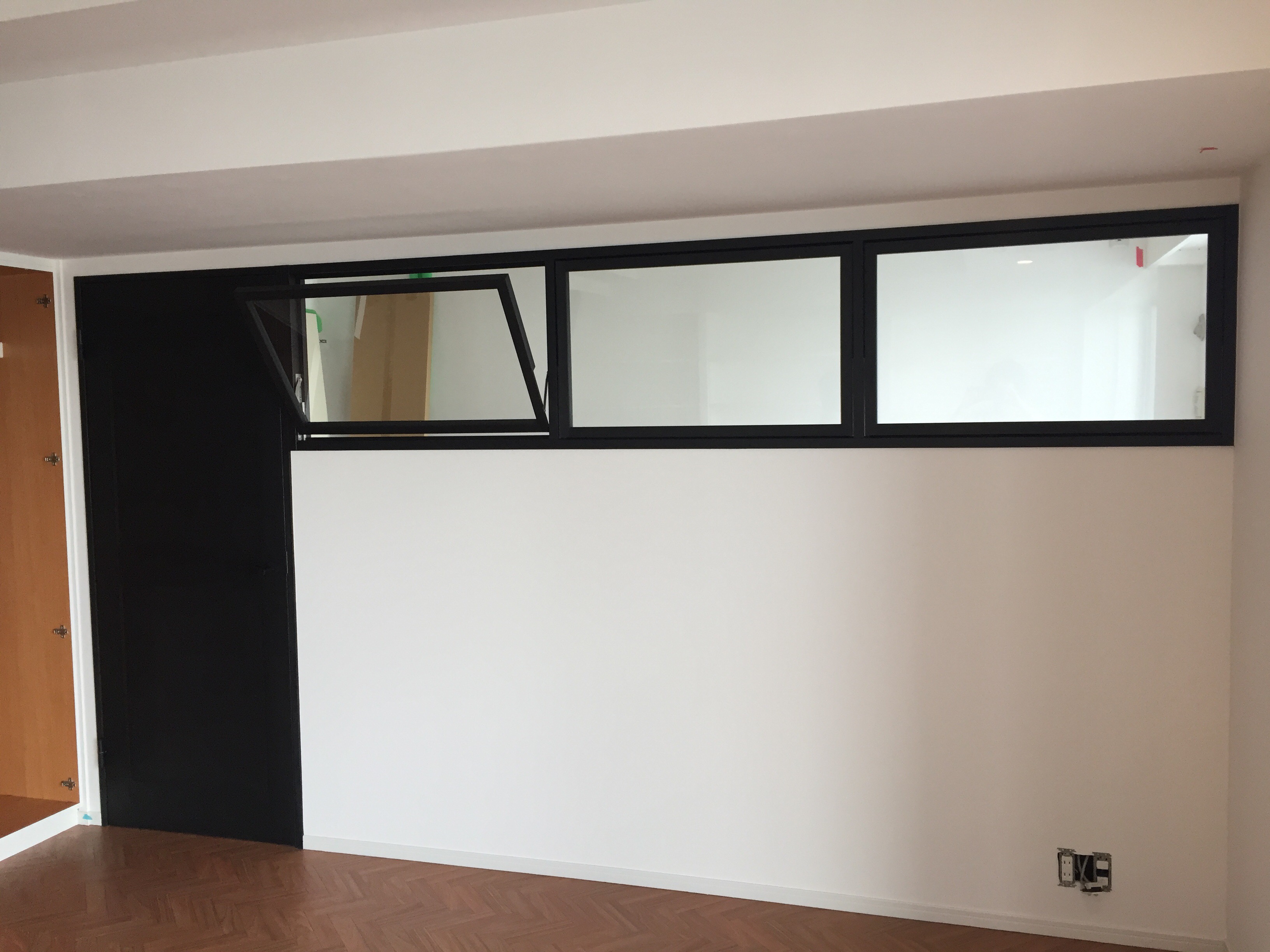 ↓室内サッシを取り付けた施工例です。(塗装前) ↓ブラックに塗装しました! アイアン製室内サッシはシャープなイメージですが、 木製特有の温もりと優しいフォルムが魅力です。