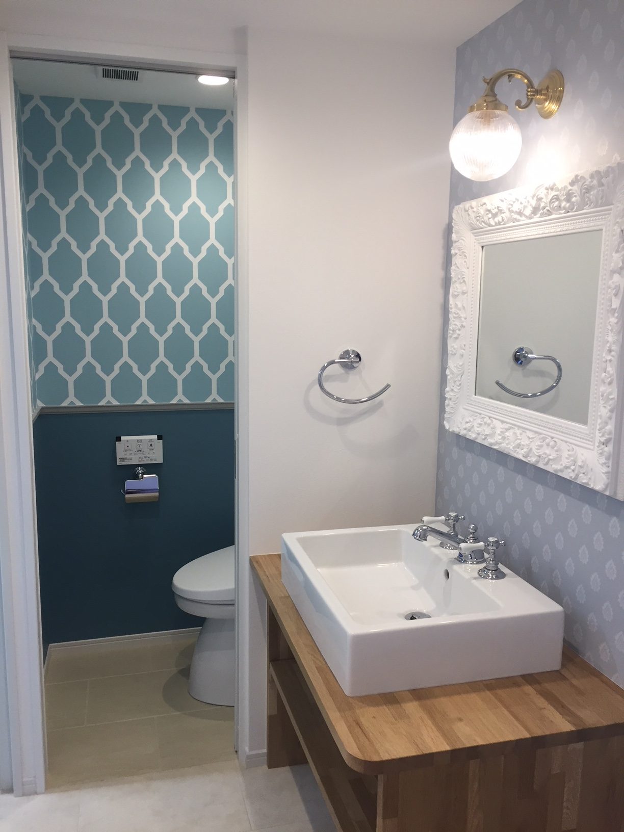 お客さまがチョイスしたブラケット照明と鏡に飾られ