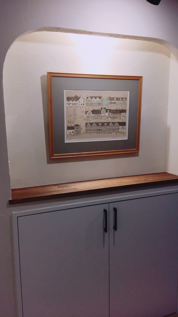 玄関ホールには、 お気に入りの絵を飾るスペースを作りました。 絵を照らすダウンライトが下がり壁に隠れています。 下部は、(非常時グッズ用の)深い収納です。...