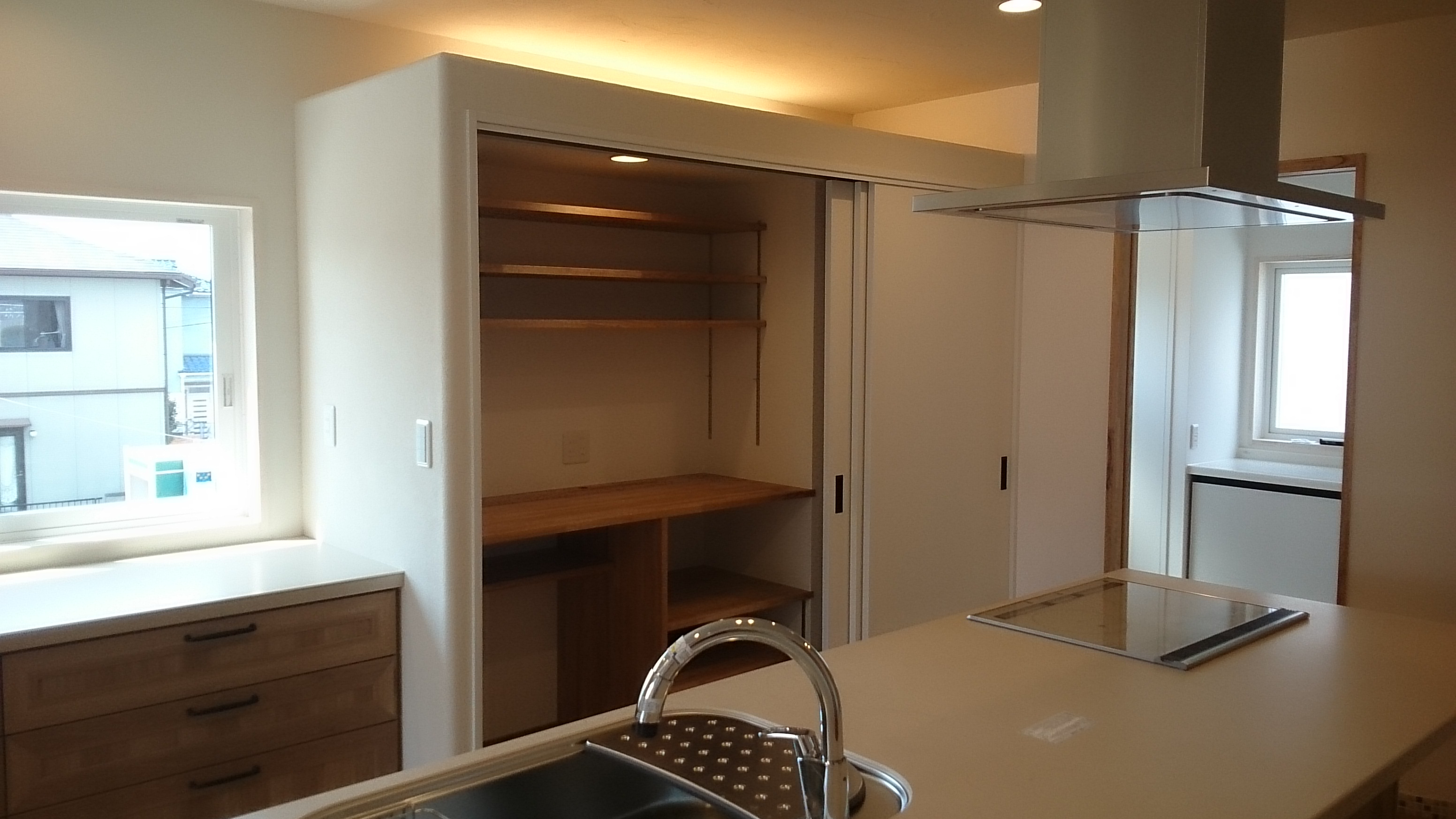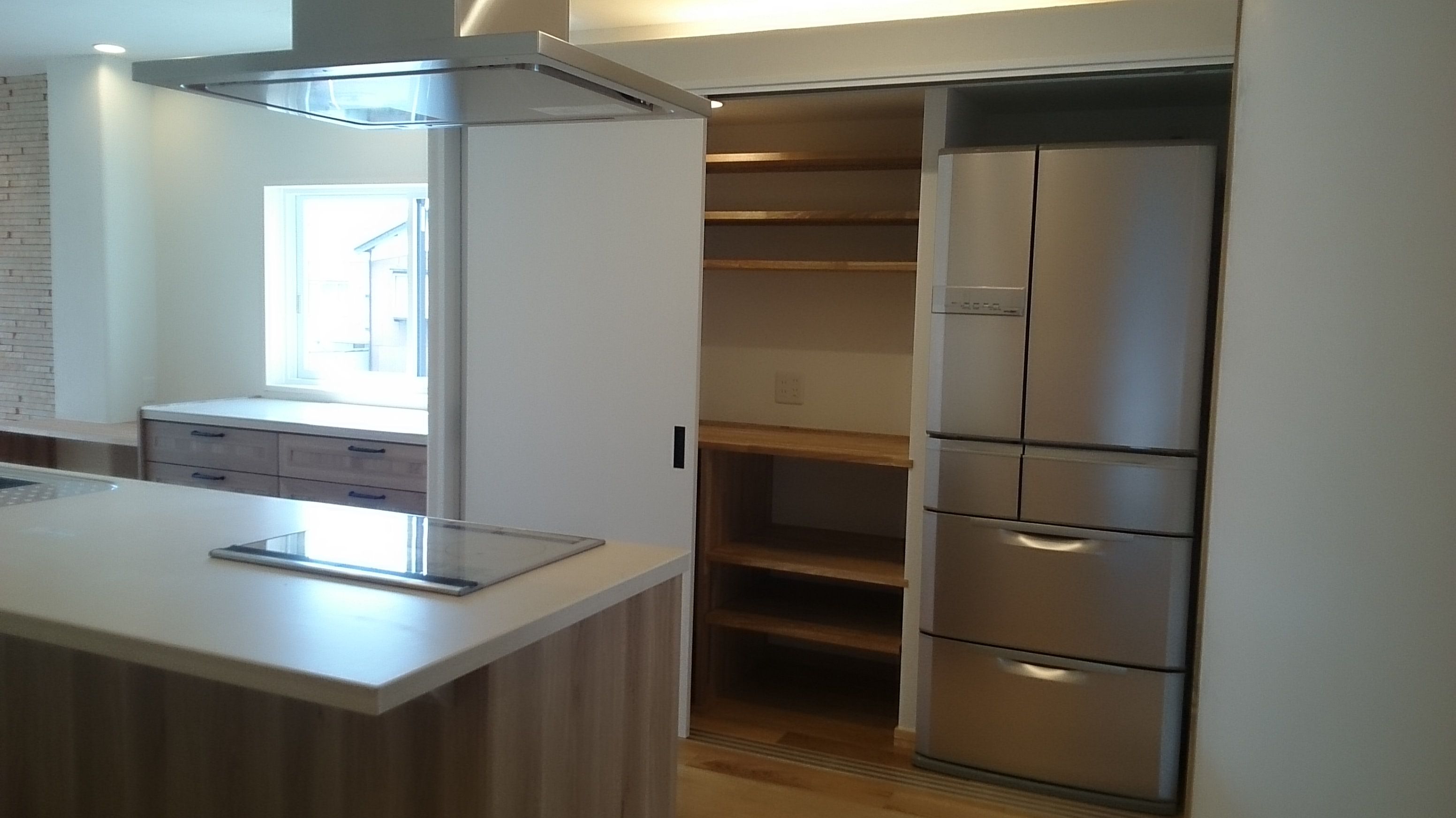 キッチン背面収納は、冷蔵庫、家電、キッチン用品が、すっきり収納できます