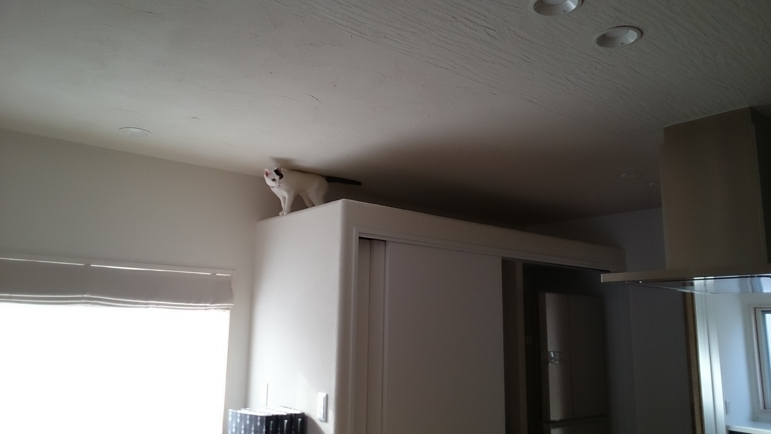 キッチン収納の上に設けた、間接照明の空間には、猫ちゃんが好んで昇っています。