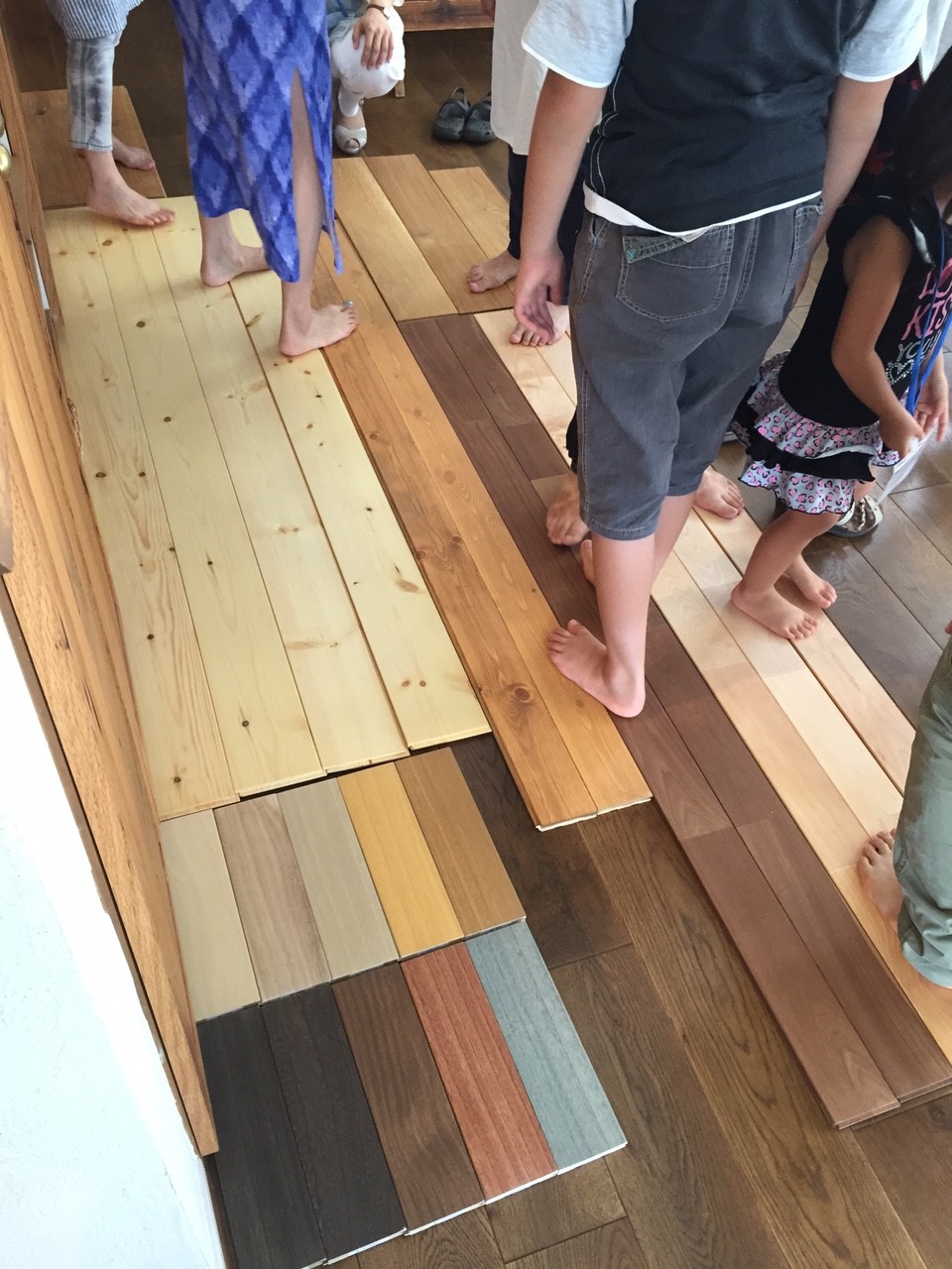 皆さん、柔らかい木、硬めの木、それぞれ踏みしめた時の違いを感じていただきました。