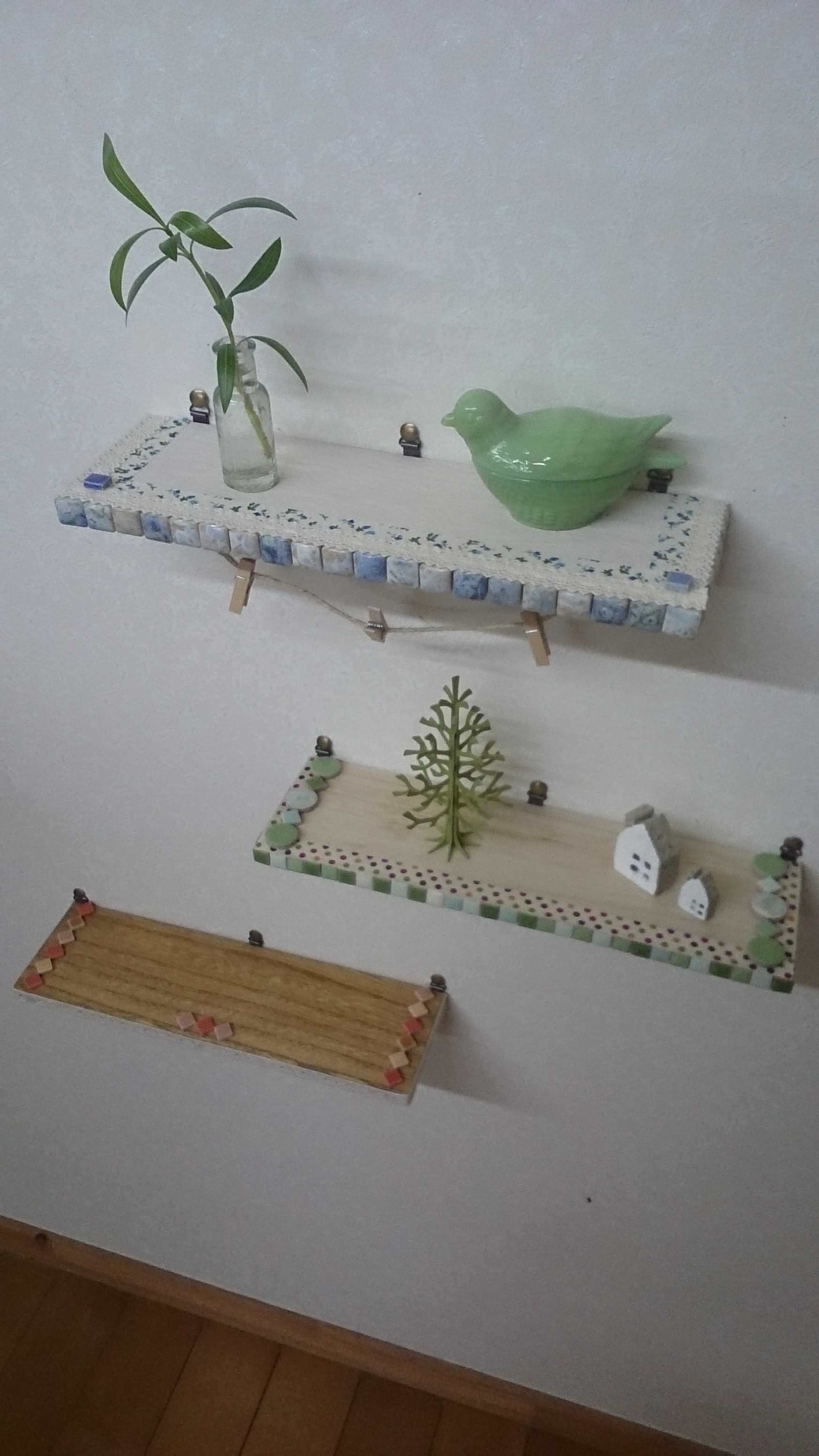 画鋲で気楽に設置できる飾り棚を作り、楽しんでいただきました。