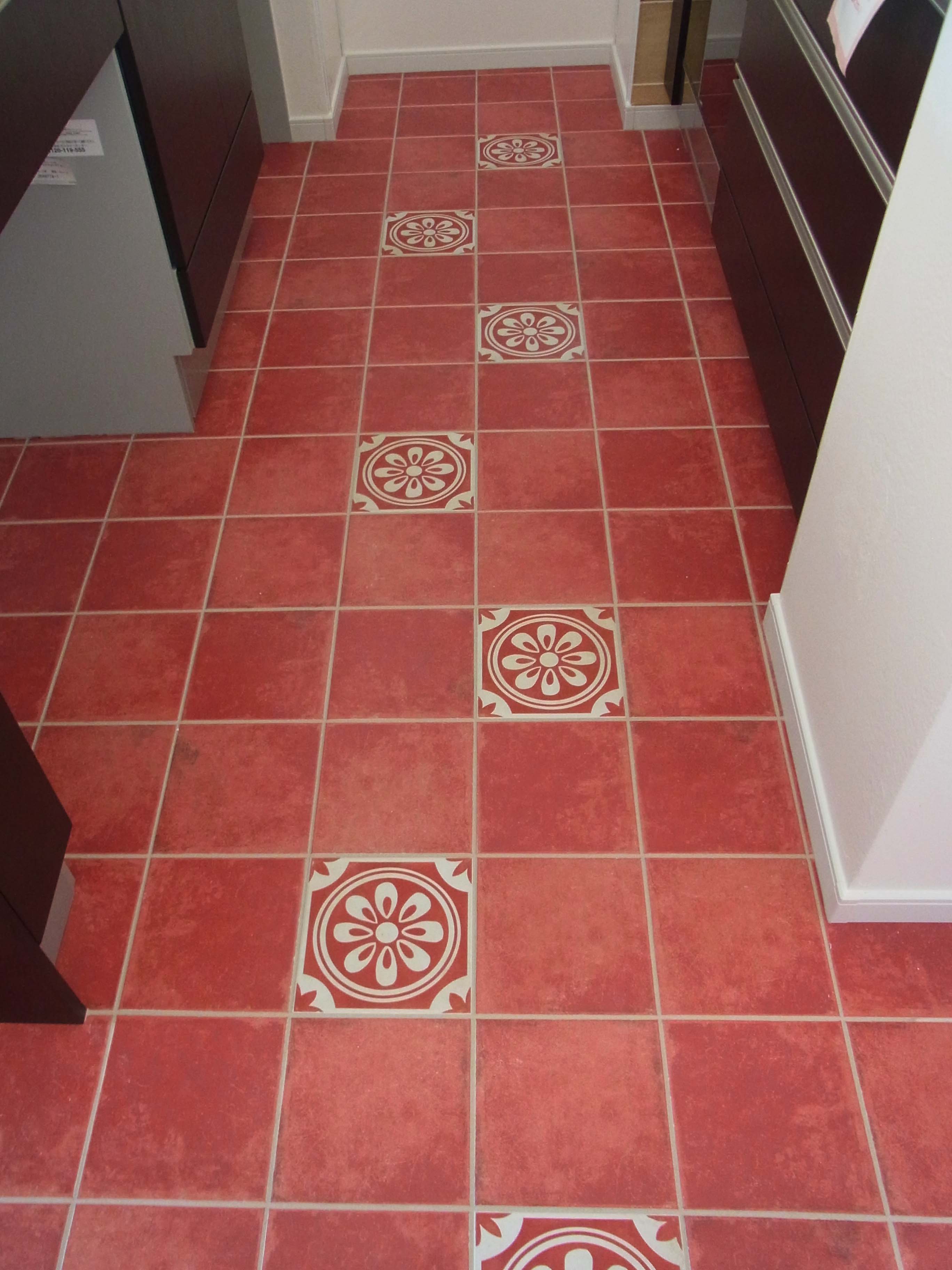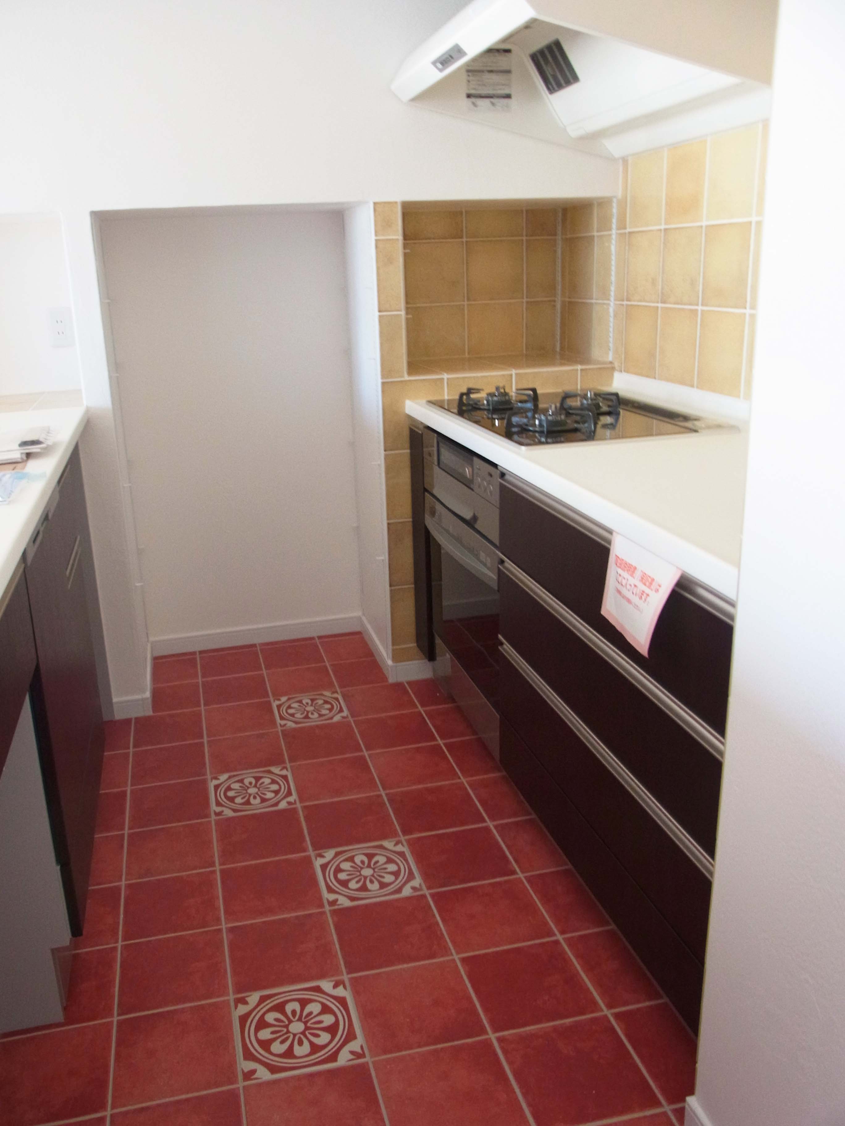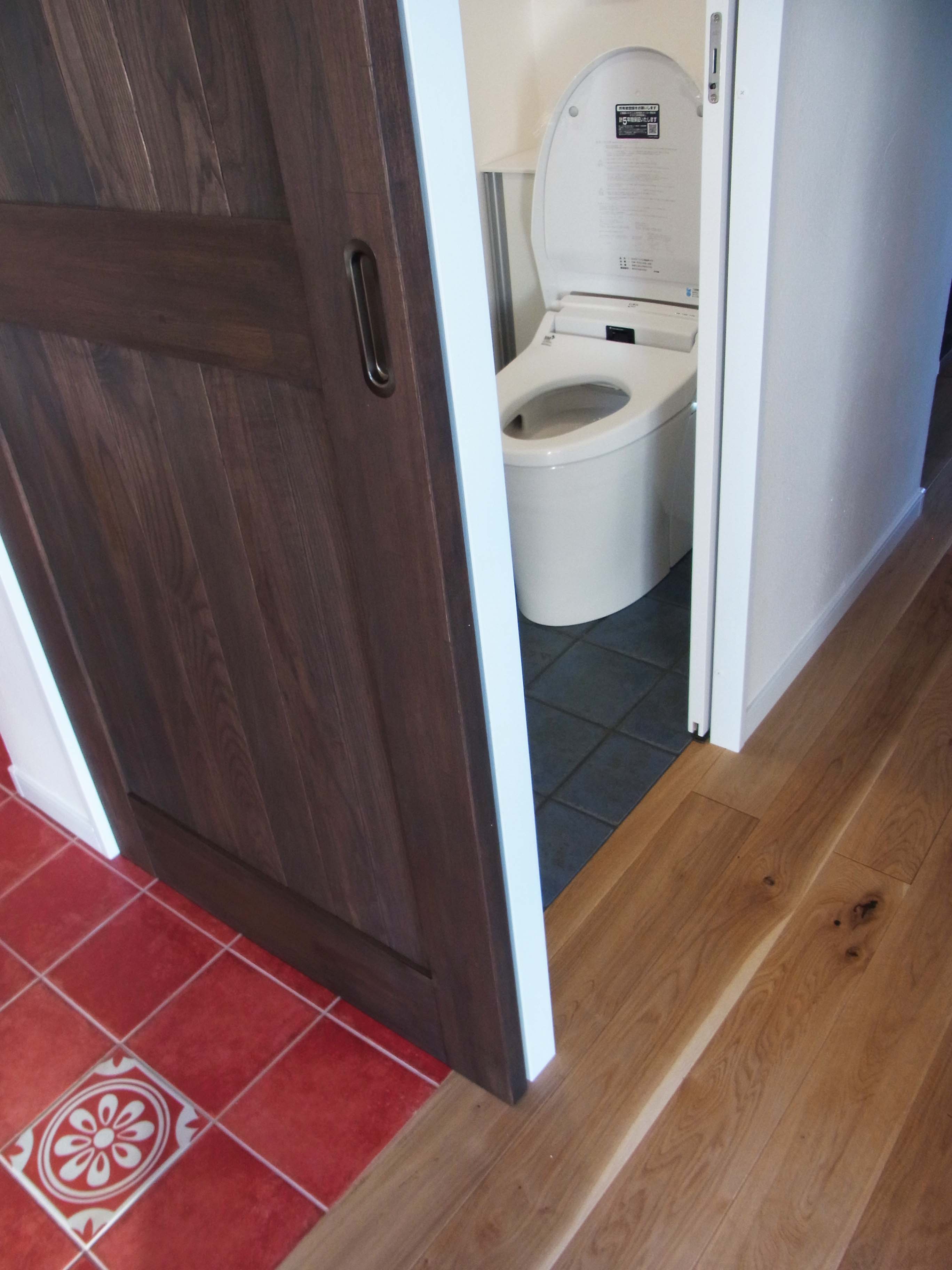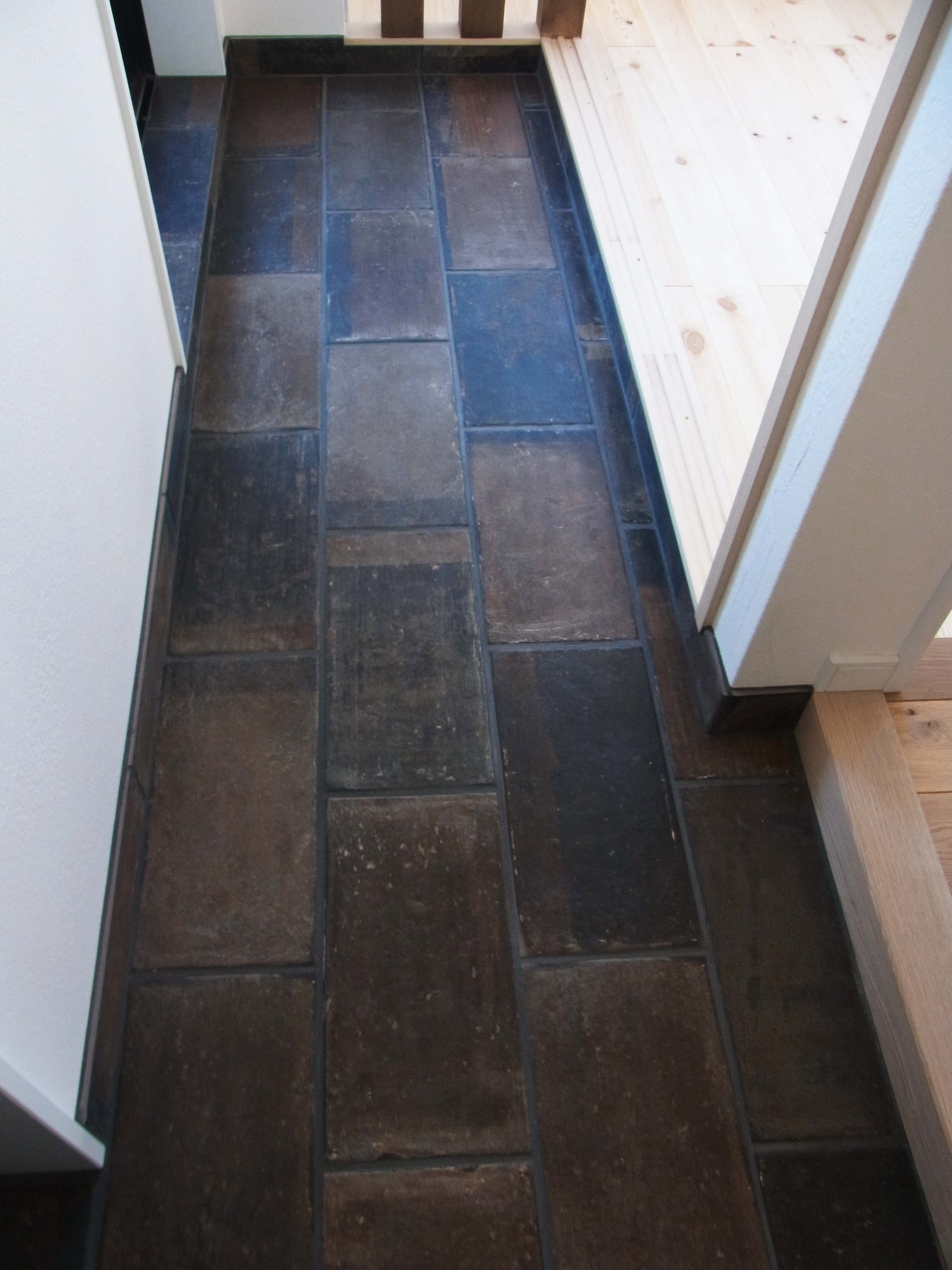 玄関続きの土間スペースも1枚・1枚違う、塗装のような雰囲気のあるタイルをお貼りしました。
