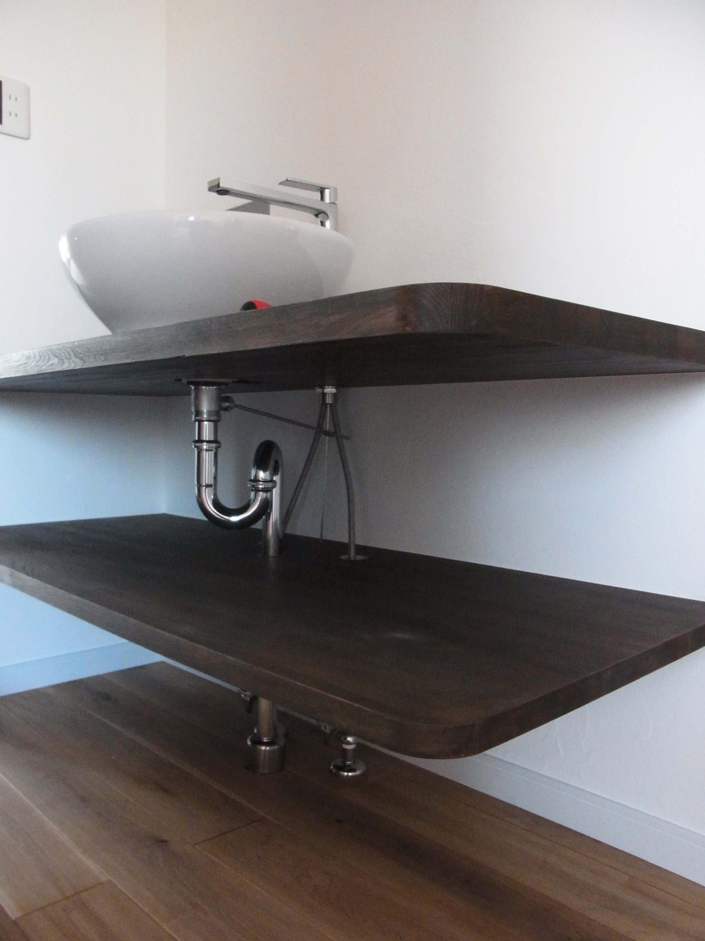 造作した洗面台の排水の穴加工も最小限で開けているので、棚が最大限活用出来ます。