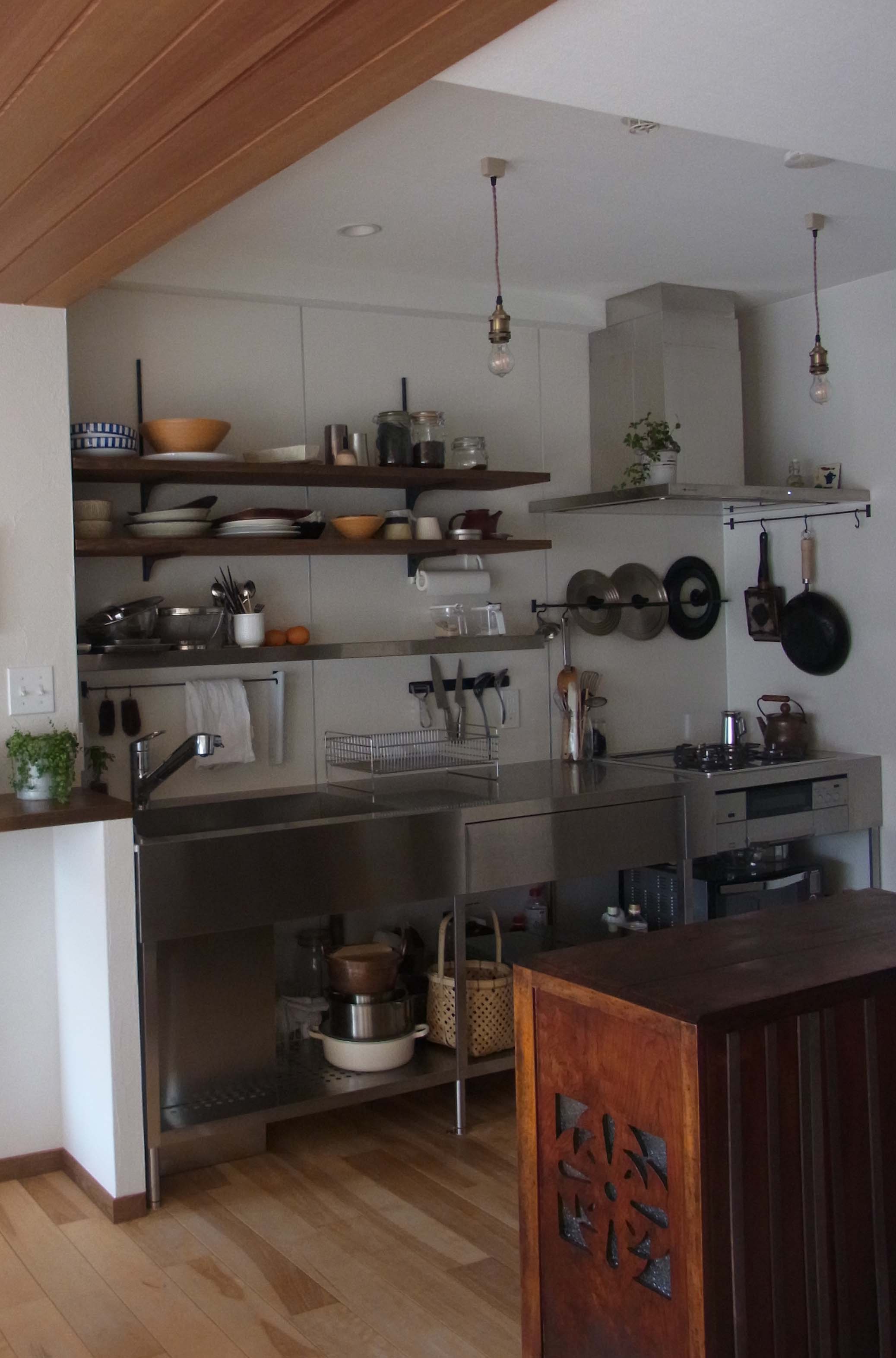 天井の板貼・ステンレスのフレームキッチンをポイントに