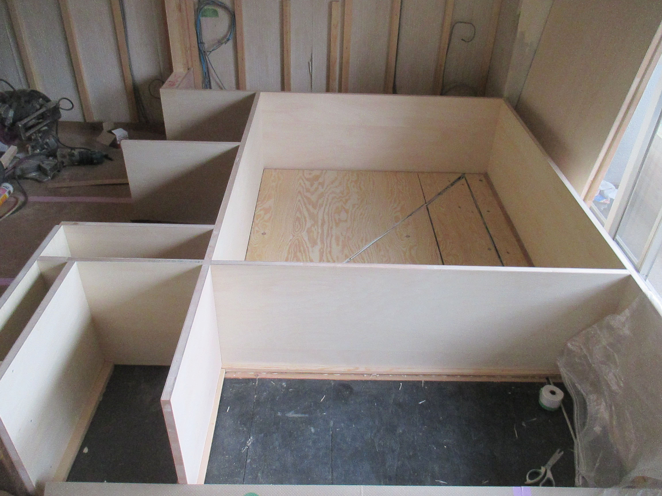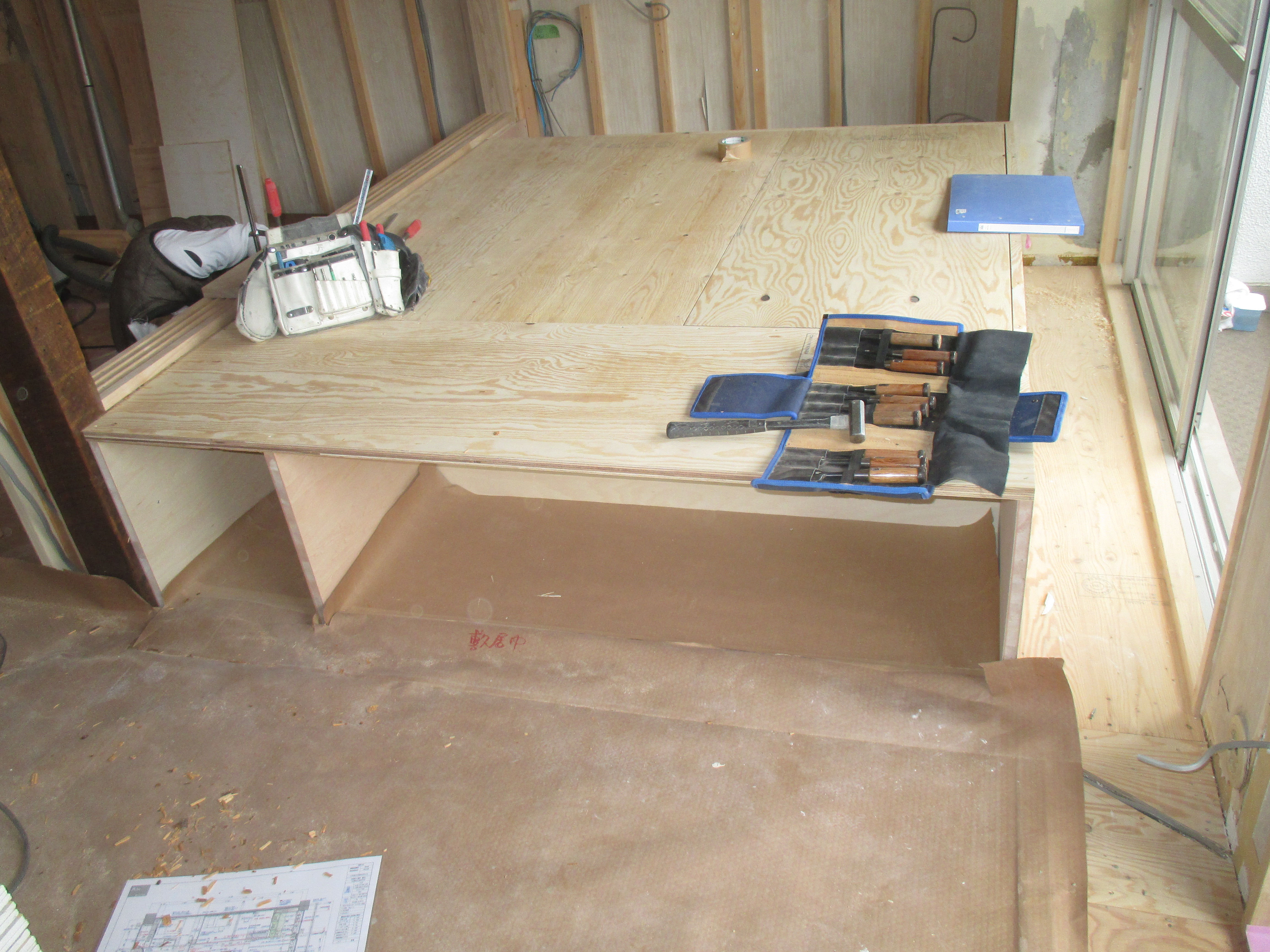 ワークスペースと収納をかねた、小上がり和スペースを造作中のお家に