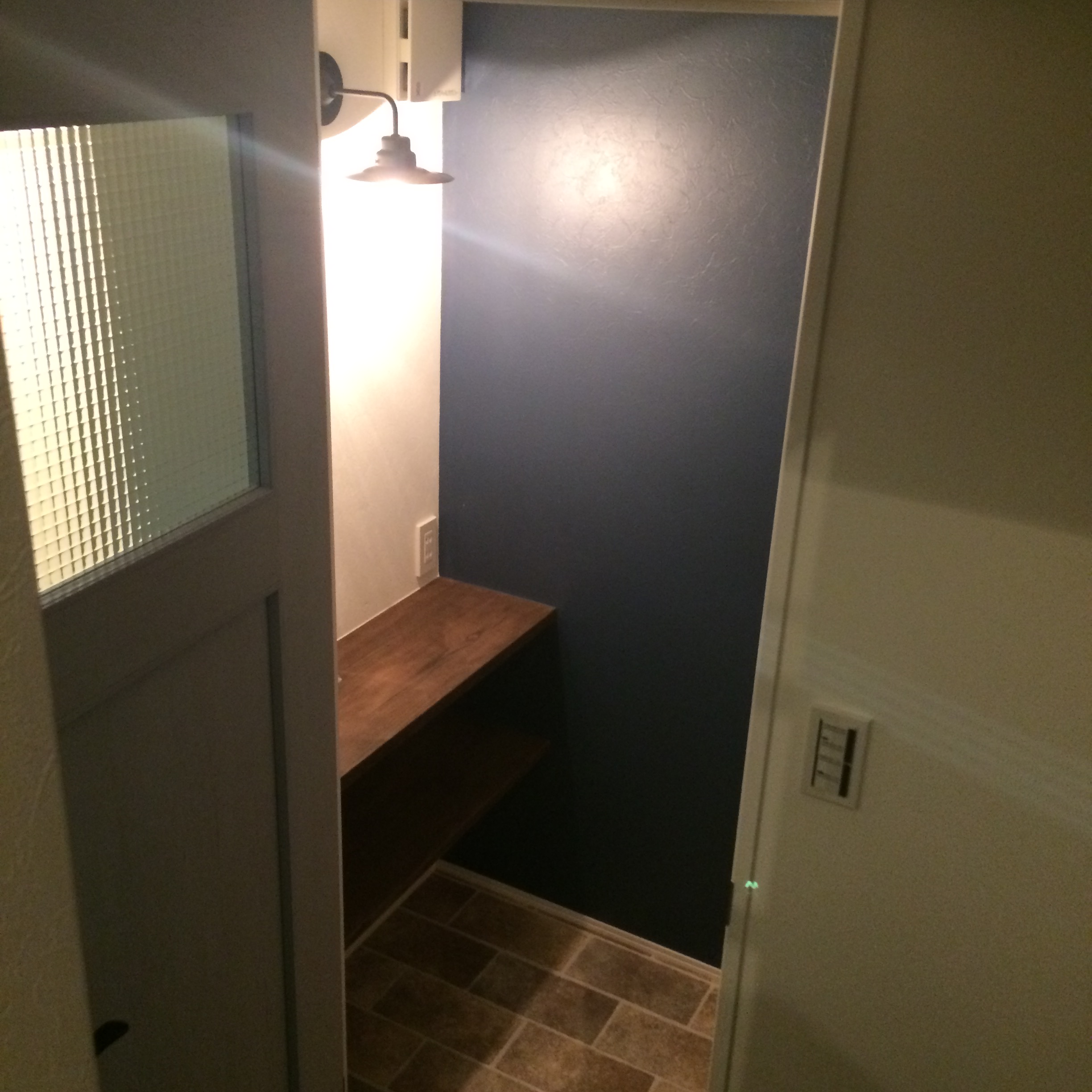 あえて、ネイビーの塗装や古材風の床材・鏡等で地下ならではのダークトーンでまとめています。