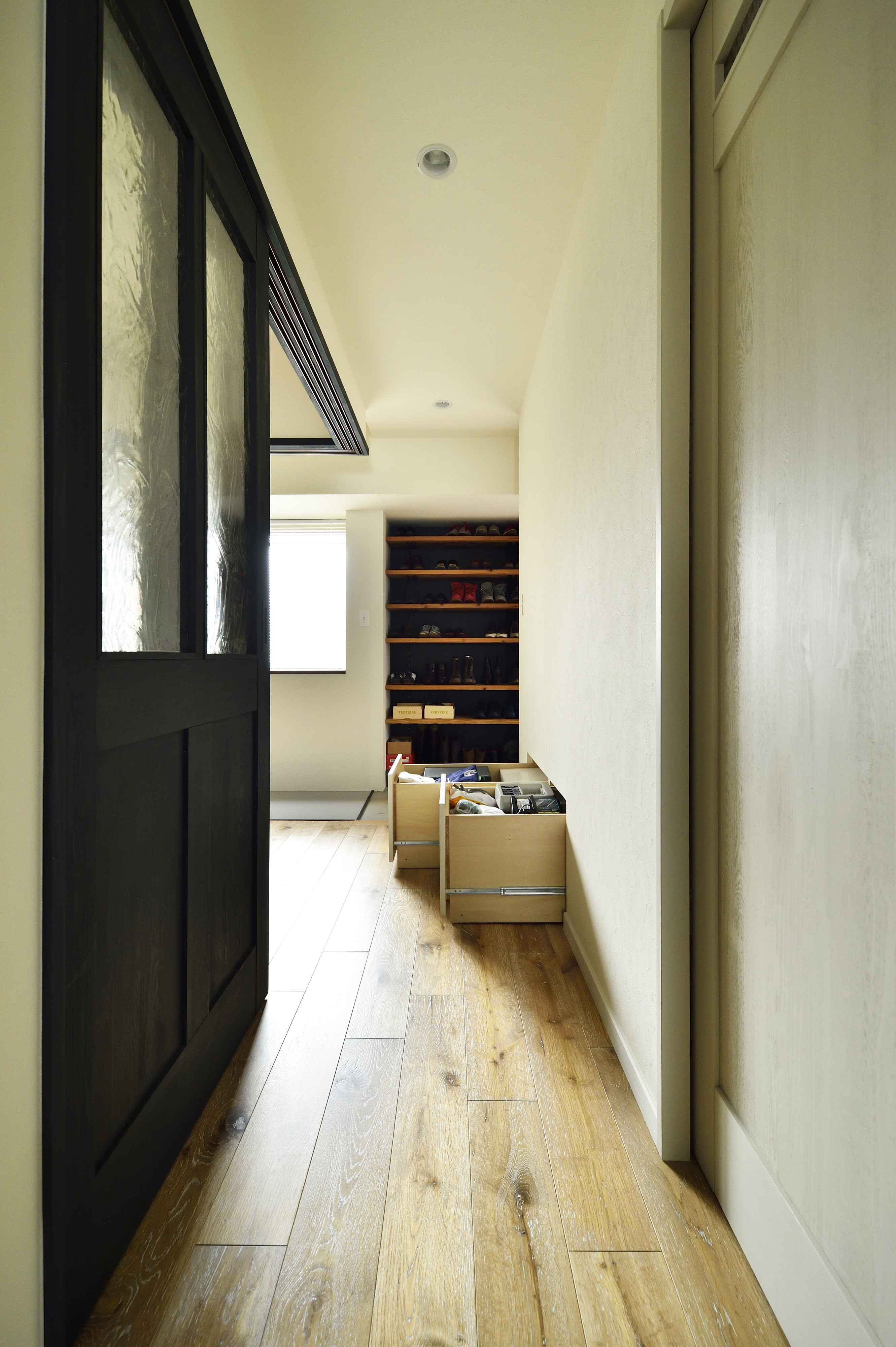 造作した引出も壁と同色で塗装しているので、