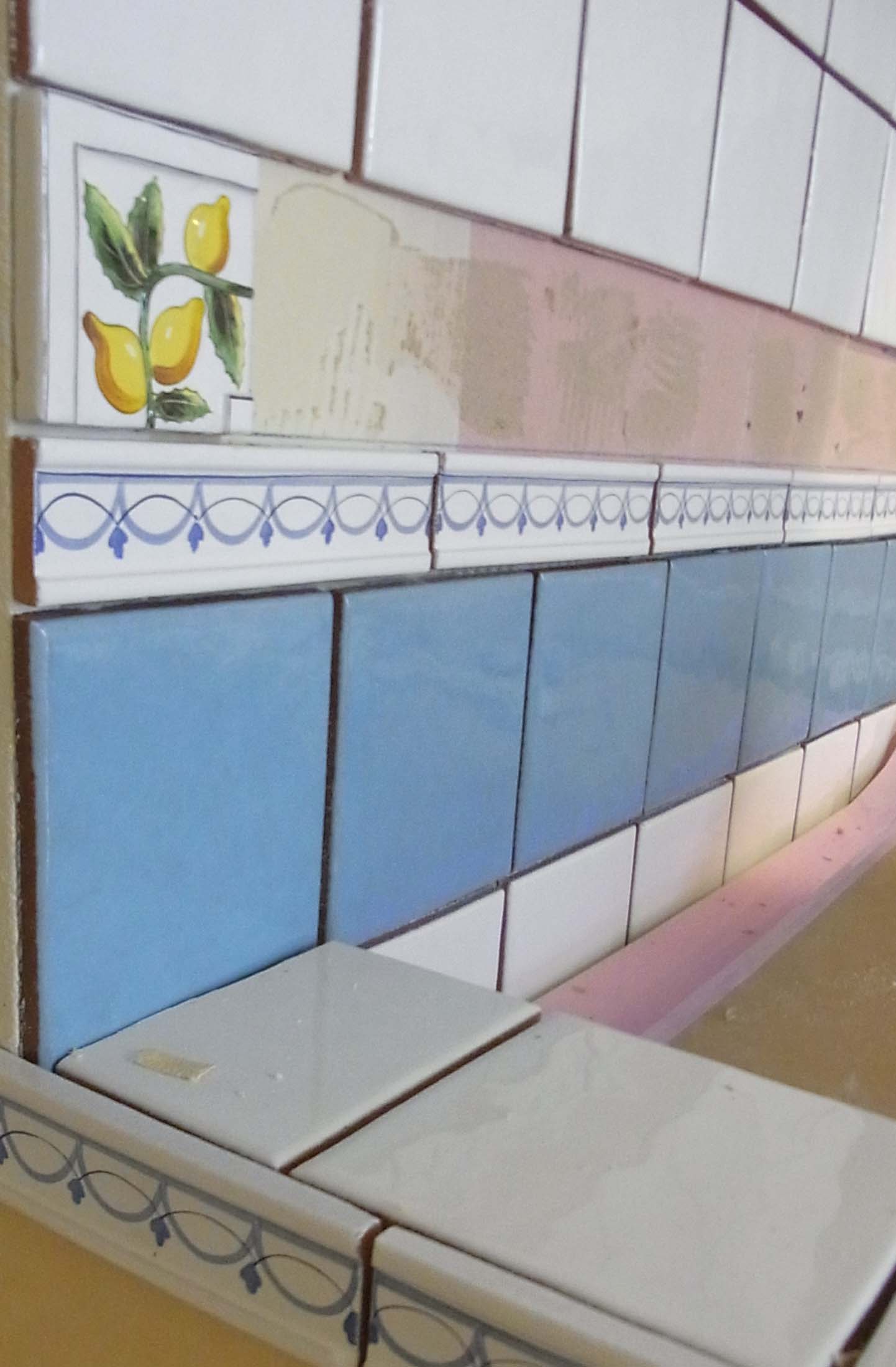 続いて、キッチンには白と水色のベースにレモン柄のタイルをデザイン。
