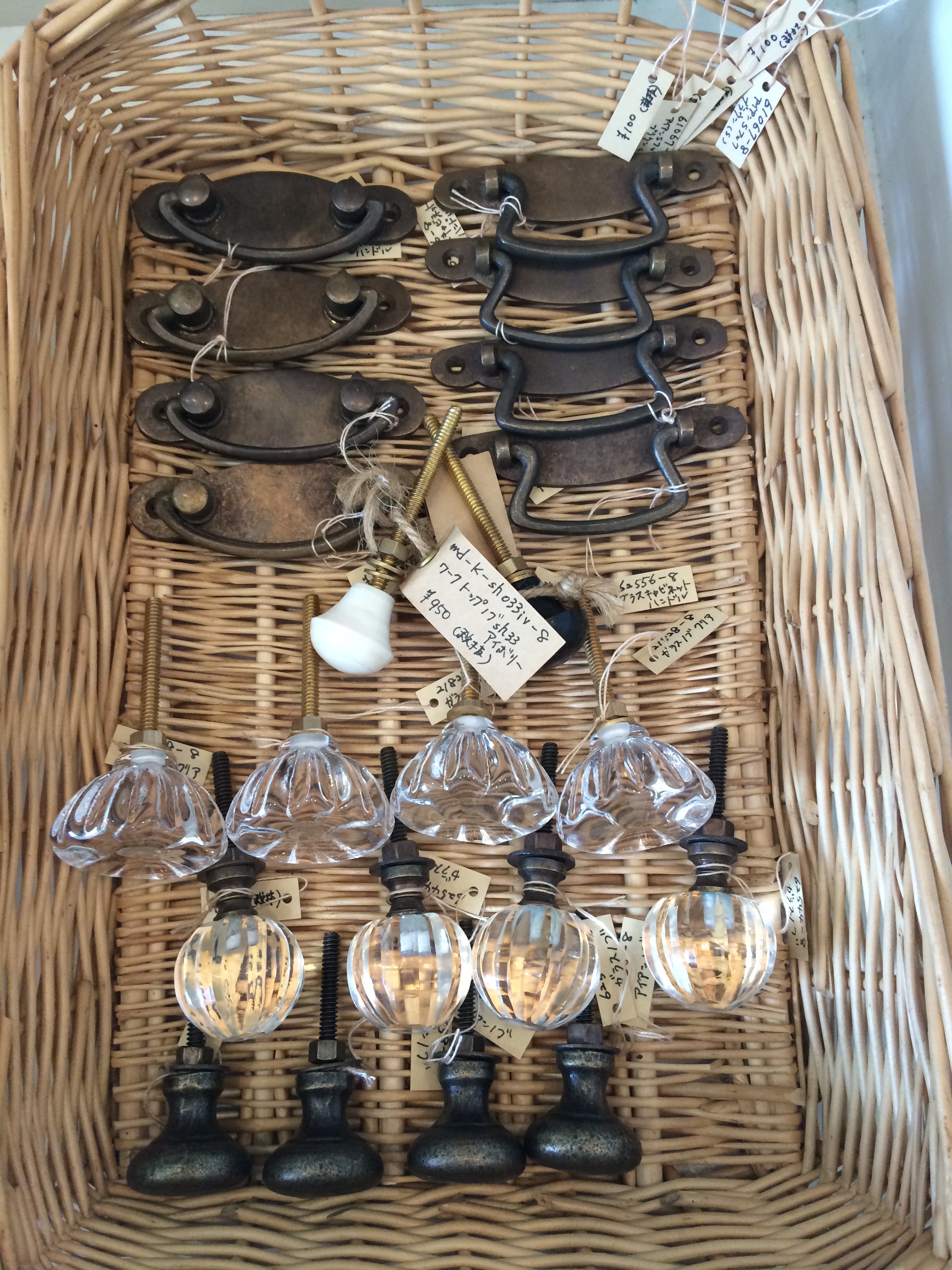 カゴの中にはブロンズ、ガラスのつまみやハンドル。