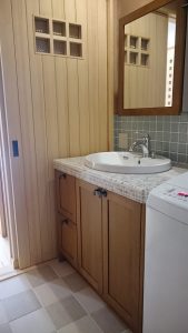 天板にモザイクタイルを用いた、ウッドワンの洗面化粧台。