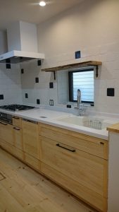 無垢(パイン)の扉のキッチンの廻りに貼りました!!