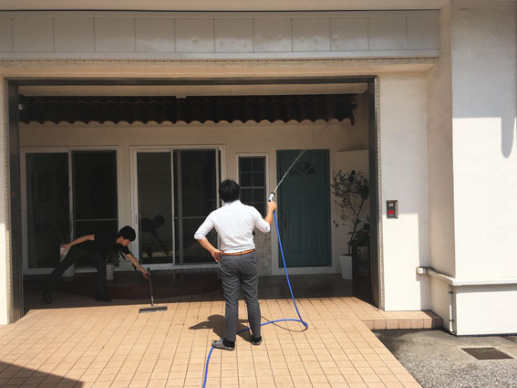 ホースを持つのは営業の野田(20代)。まるで日曜日のお父さんのような貫録で掃除がはかどります。