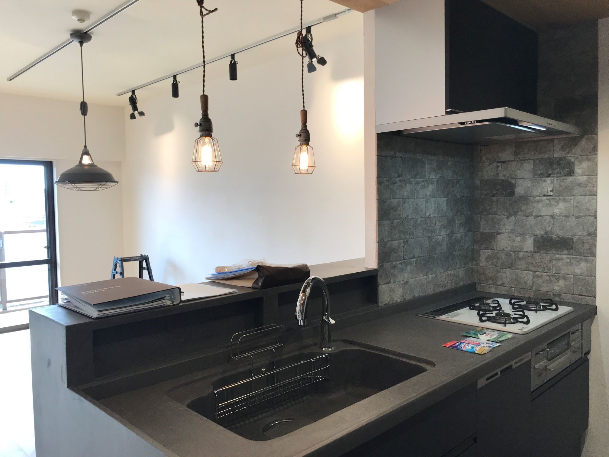 ↓シンプルなシステムキッチンもモールテックスで覆うだけで風合いが増します