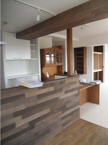 梁には本物のヴィンテージ材・キッチン腰壁には古材風の加工材・柱や造作材はきれいな無垢で構成しています。