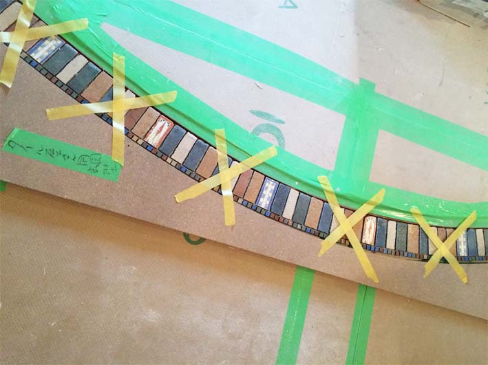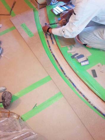きれいなRの下地を大工さんが作り、そこにタイル屋さんが微調整をしながら1コ1コ貼り進めていきます。