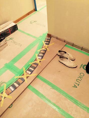 天然石のキューブ&ラフな形のボーダータイルのカラフルな組合せは、お家に入って最初の見せ場になる予定。