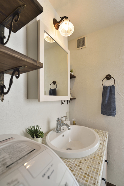 今はなんと造作風のタイル天板のこんな可愛らしい洗面台があります。