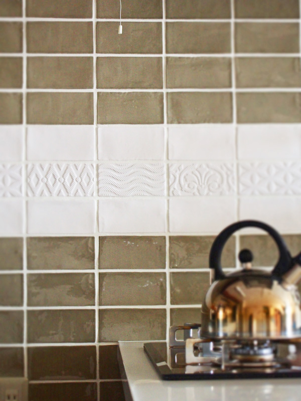 上下の落ち着いたオリーブグリーンに、帯でホワイトの同じサイズのタイル。