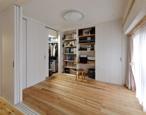 リビング奥に作った変形のウォークインクローゼットと壁面収納。 写真向かって左側がウォークインクローゼット。 3枚扉の右から2枚分がウォークイン。 右側は奥行きの少ない棚になっています。 正...