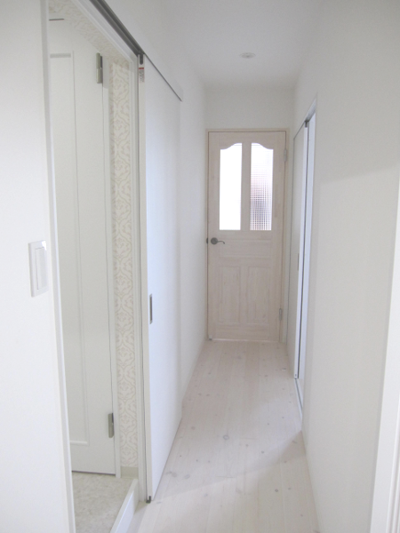 床、壁、ドア何から何まで白にこだわったお宅の完成確認に行って参りました。 玄関を入ると廊下からリビングに抜けてホワイトの無垢フローリング。 パインのフローリングに白い自然塗料を仕上げていますので、 冷たい白ではなく、...