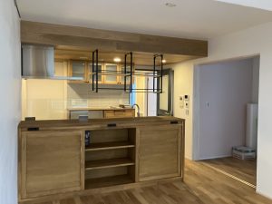 現場確認に行ってきました。 コンセント付のキッチンカウンター収納。 引戸は2枚で1枚分が飾り棚に。 製作お願いしたところ:林蔵 上にはハシゴ型の金具に棚を乗せたオープン棚 商品:ウッドワン・無垢の木の収...